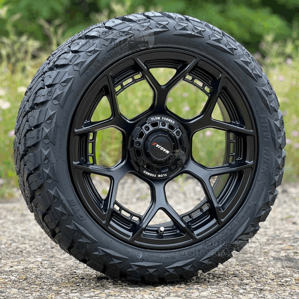 - Tires & Wheels: Pair your lift kit with a pre-assembled tire and wheel package for a bolt-on solution. Check out the 15″ MadJax Evolution Flow Form Matte Black Golf Cart Wheels and 23x10R15 GTW Maverick Steel Belted Radial All Terrain Tires – Set of 4 (23″ tall) for a rugged, all-terrain look that’s ready for anything.