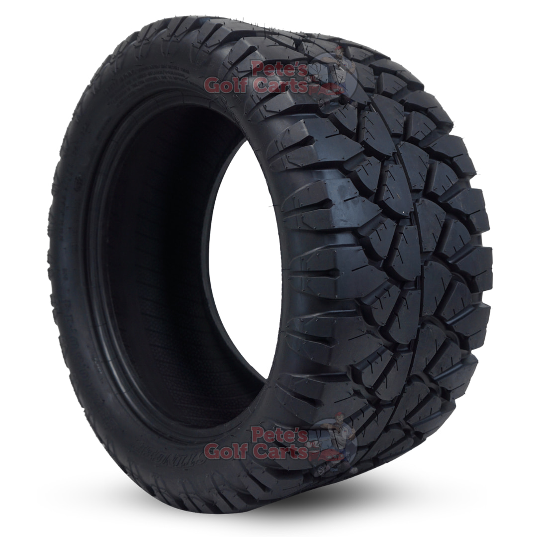 The Stinger 23×10.5-14 DOT All Terrain golf cart tires are a perfect replacement for your 14″ Golf cart wheels! These tires are designed for golf cart enthusiasts that use their carts everyday on light off-road trails, streets, or campground applications. This stylish and non-directional tread design results in low road noise with aggressive grip when you need it. The 23×10.5-14 tire has a 4.5″ sidewall all the way around your 14″ golf cart wheel once mounted.