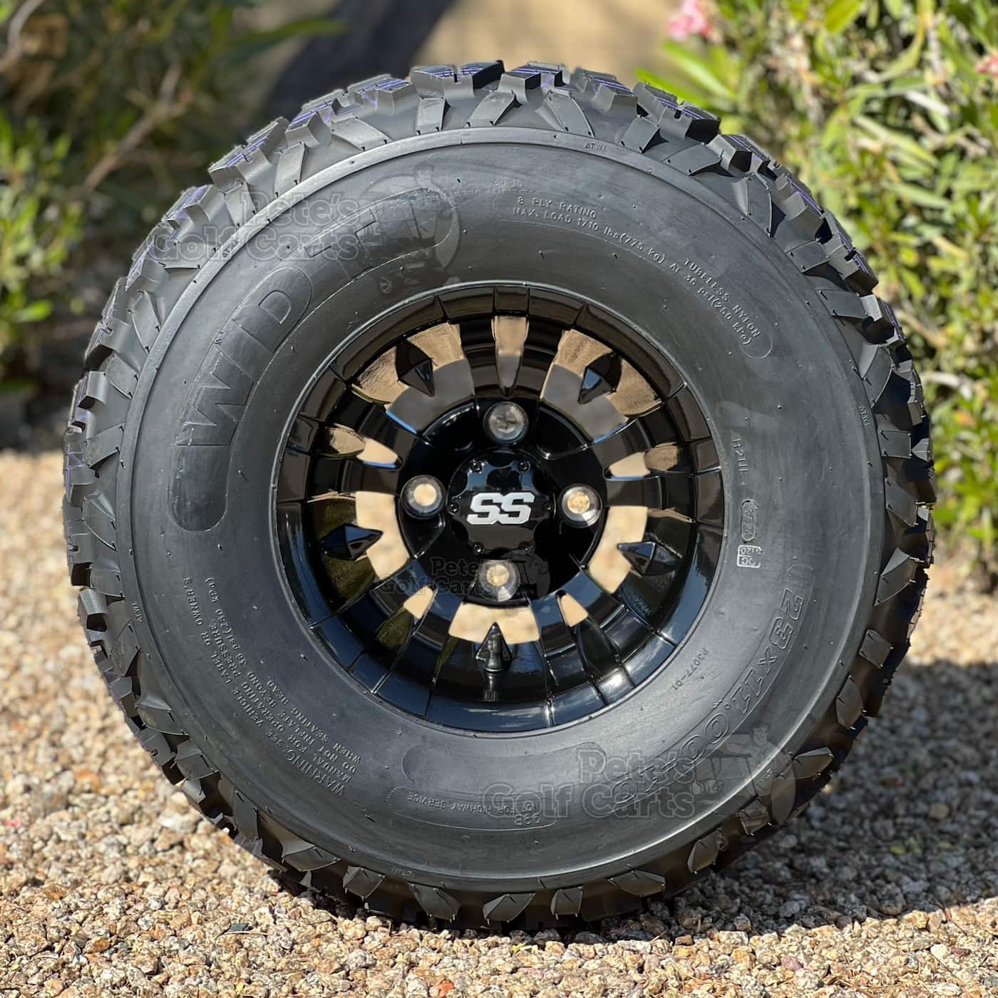 Order your 10″ Vampire Gloss Black Golf Cart Wheels and 23″ tall 8-ply off road tires combo today and see the difference for yourself! When you buy a set of wheels and tires from Pete’s you can rest assured you are getting the best deal anywhere. This is because of the valuable relationships cultivated over many years in the golf cart wheel and tire industry. This combo set installs in only a few minutes!