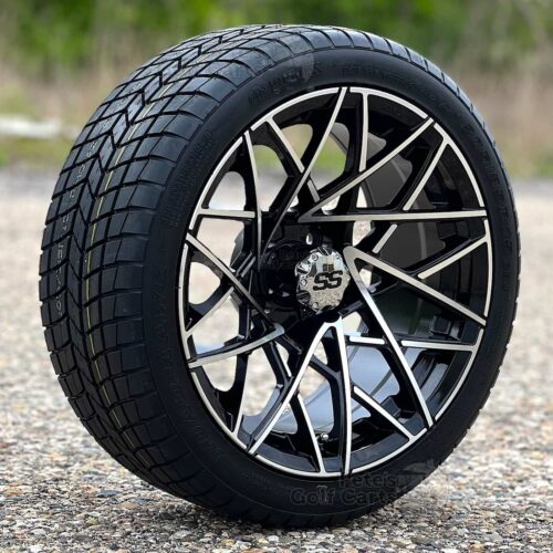 - 4 x 15″ RX395 Black/Machined Aluminum Golf Cart Wheels mounted on