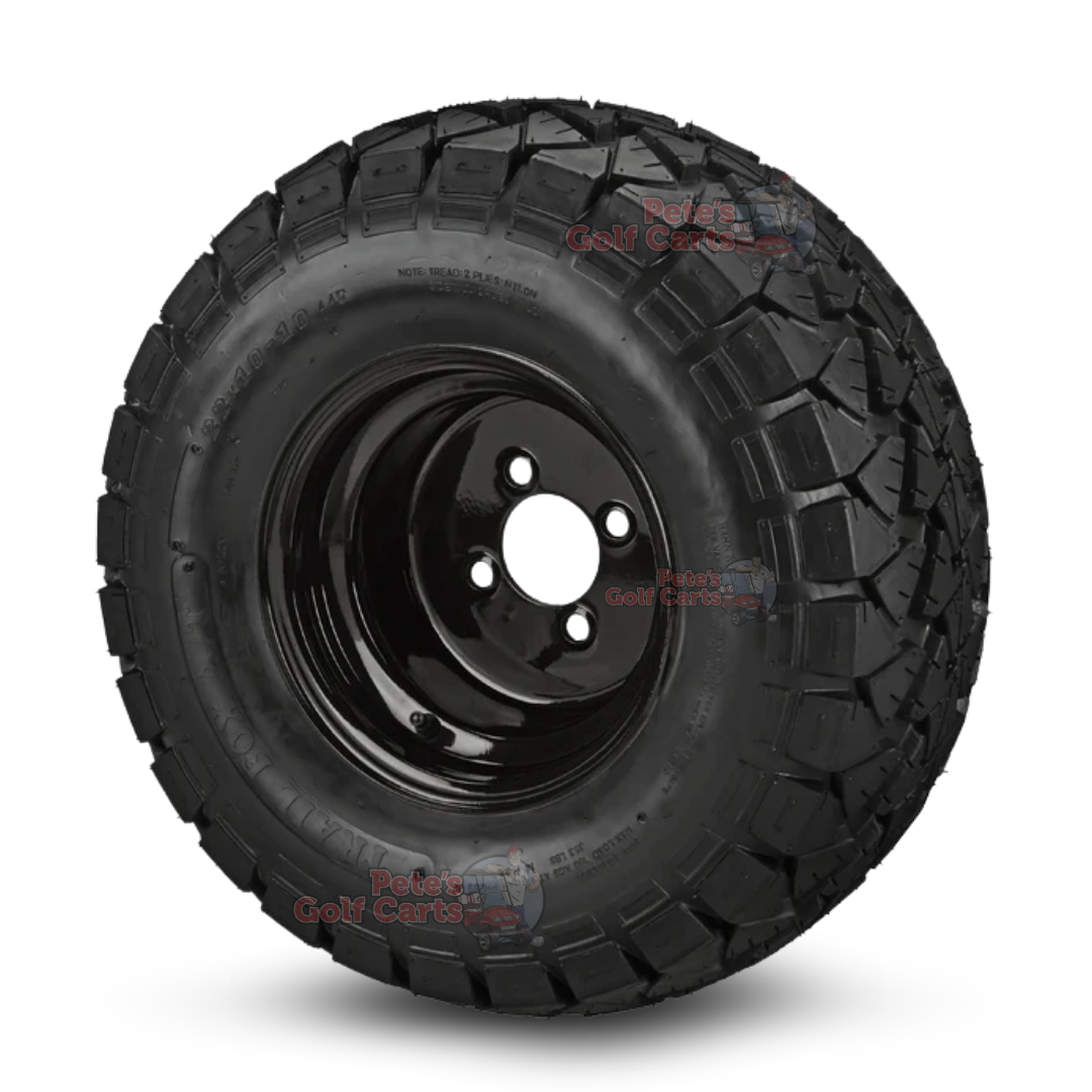 Do you love the old MadJax Timberwolf Tires (Now GTW Timberwolf)? Those Timberwolf tires are a fantastic tire! The Trail Fox the exact same tire tread, same specs, at a fraction of the price. People are catching on and ordering these sweet Trail Fox tires that are DOT approved and great on trails as well as hard surfaces like pavement and paths. We have paired this popular 22×10-10 Tire with the 10″ Black Steel golf cart wheel for a killer combo.
