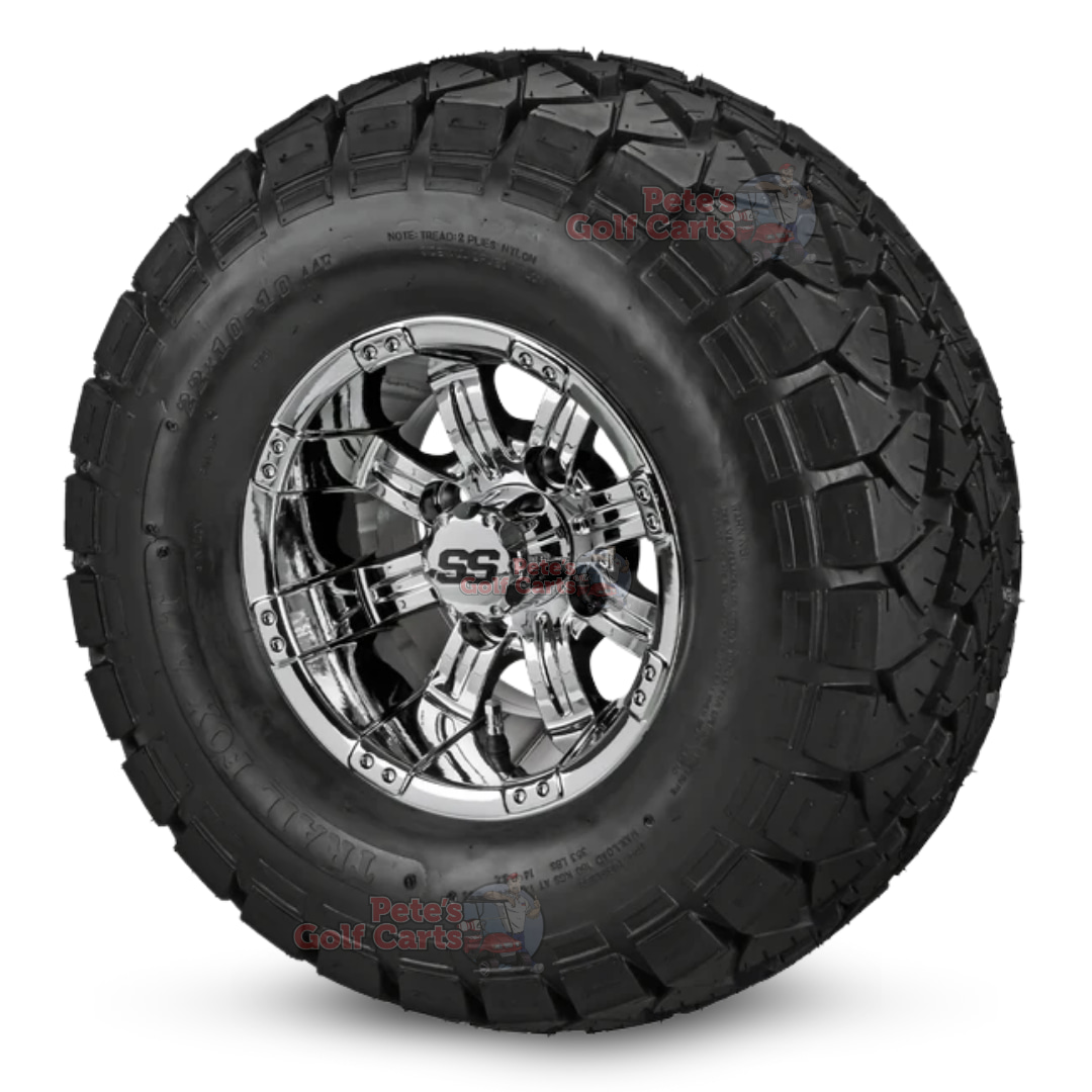 Do you love the old MadJax Timberwolf Tires (Now GTW Timberwolf)? Those Timberwolf tires are a fantastic tire! The Trail Fox the exact same tire tread, same specs, at a fraction of the price. People are catching on and ordering these sweet Trail Fox tires that are DOT approved and great on trails as well as hard surfaces like pavement and paths. We have paired this popular 22×10-10 Tire with the 10″ Terminator Chrome golf cart wheel for a killer combo. The Chrome spokes of the Terminator wheel shine brilliantly to catch the eyes of onlookers as you roll by. A perfect match for your lifted EZGO, Club Car or Yamaha golf cart!