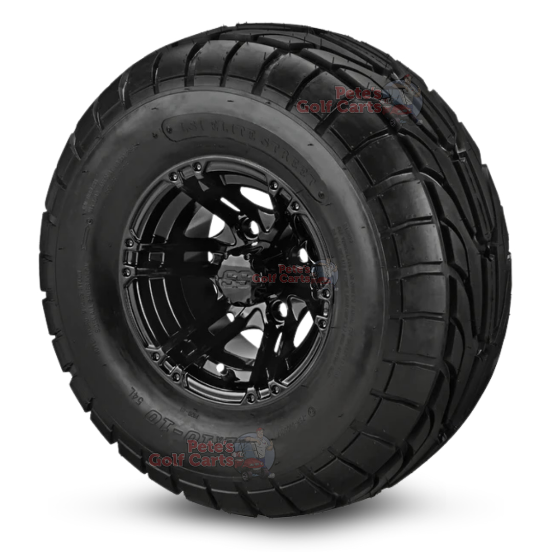 A fantastic street and turf golf cart tire set for your lifted golf cart! Purchase these beautiful 10″ Terminator Gloss Black golf cart wheels with our 22×10-10 DOT Street/Turf tires and experience the difference instantly! Navigate the golf course safely and keep that superintendent happy by now tearing up his fairways!