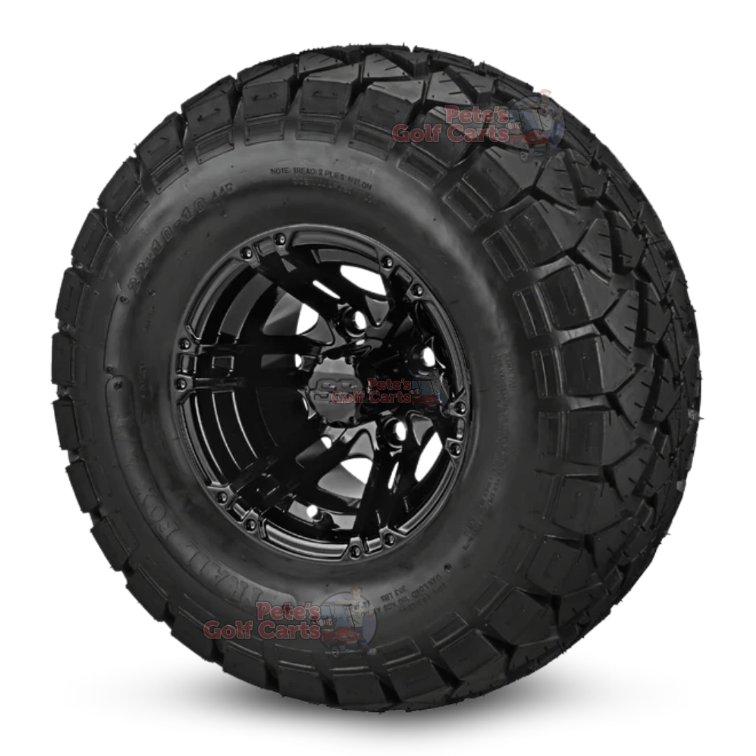 Do you love the old MadJax Timberwolf Tires (Now GTW Timberwolf)? Those Timberwolf tires are a fantastic tire! The Trail Fox the exact same tire tread, same specs, at a fraction of the price. People are catching on and ordering these sweet Trail Fox tires that are DOT approved and great on trails as well as hard surfaces like pavement and paths. We have paired this popular 22×10-10 Tire with the 10″ Terminator Gloss Black golf cart wheel for a killer combo. The need a lift kit to accommodate this stellar wheel and tire combo (see golf cart lift kit requirements below). Designed to conquer both the streets and mild trails, after you get this set mounted your cart will never feel the same!