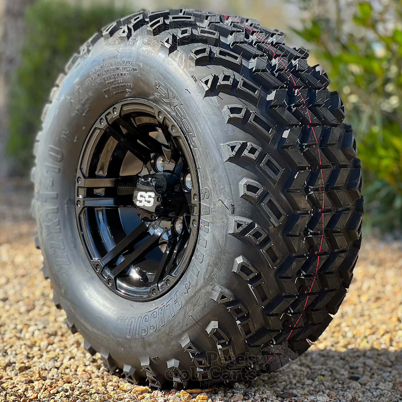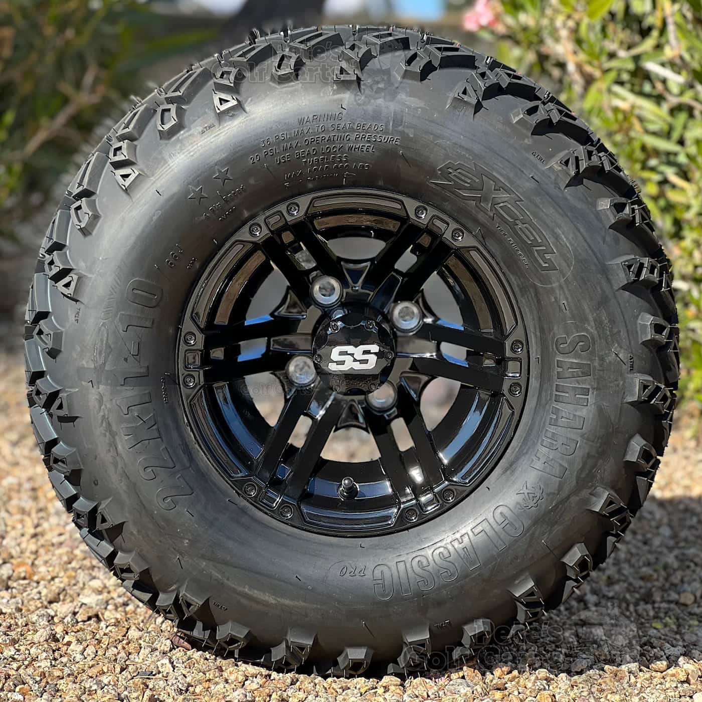 The classic 6-spoke 10″ Terminator Gloss Black Golf Cart wheels are a tough look that comes professionally mounted with our 22×11-10 Sahara Classic DOT all terrain golf cart tires that are capable of taking over just about any terrain! The directional tread pattern of the Excel Sahara Classic is a great option and boasts a strong load rating along with a speed rating of “J” which is rated to travel up to 62 miles per hour.