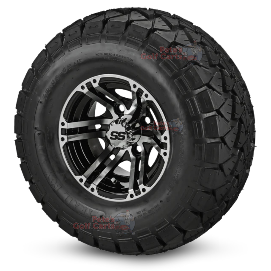 Do you love the old MadJax Timberwolf Tires (Now GTW Timberwolf)? Those Timberwolf tires are a fantastic tire! The Trail Fox the exact same tire tread, same specs, at a fraction of the price. People are catching on and ordering these sweet Trail Fox tires that are DOT approved and great on trails as well as hard surfaces like pavement and paths. We have paired this popular 22×10-10 Tire with the 10″ Terminator black/machined golf cart wheel for a killer combo. The machined spokes of the Terminator wheel shine brilliantly to catch the eyes of onlookers as you roll by. A perfect match for your lifted EZGO, Club Car or Yamaha golf cart!