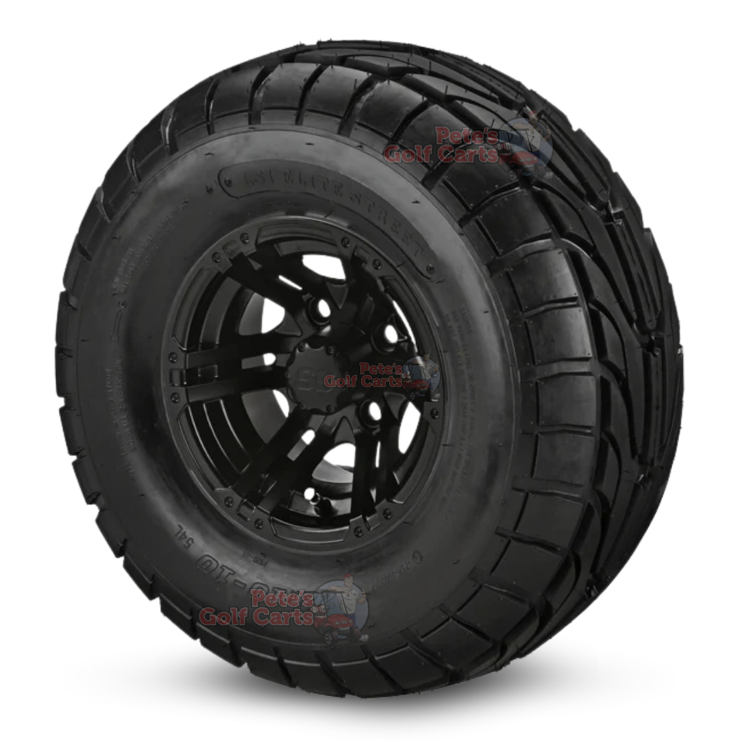 A fantastic street and turf golf cart tire set for your lifted golf cart! Purchase these beautiful 10″ Terminator Matte Black golf cart wheels with our 22×10-10 DOT Street/Turf tires and experience the difference instantly! Navigate the golf course safely and keep that superintendent happy by now tearing up his fairways!