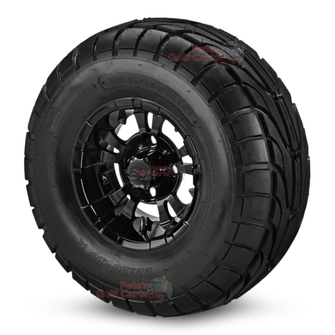 A fantastic street and turf golf cart tire set for your lifted golf cart! Purchase these beautiful 10″ Vampire Gloss Black golf cart wheels with our 22×10-10 DOT Street/Turf tires and experience the difference instantly! Navigate the golf course safely and keep that superintendent happy by now tearing up his fairways!