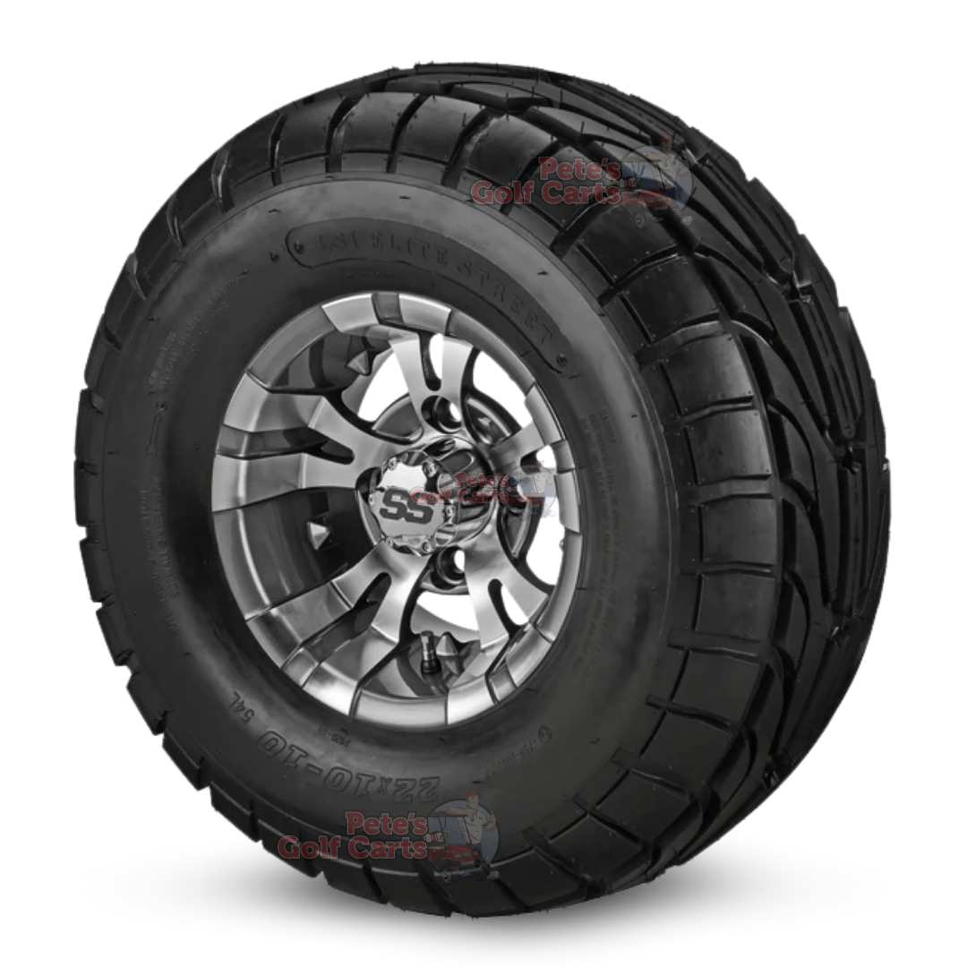 A fantastic street and turf golf cart tire set for your lifted golf cart! Purchase these beautiful 10″ Vampire Gunmetal golf cart wheels with our 22×10-10 DOT Street/Turf tires and experience the difference instantly! Navigate the golf course safely and keep that superintendent happy by now tearing up his fairways!
