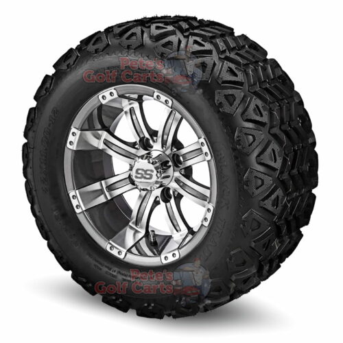 Upgrade your non-lifted golf cart with this beautiful set of 12″ Tempest Gunmetal/Machined golf cart wheels and 22″ DOT DOT All Terrain golf cart tires.