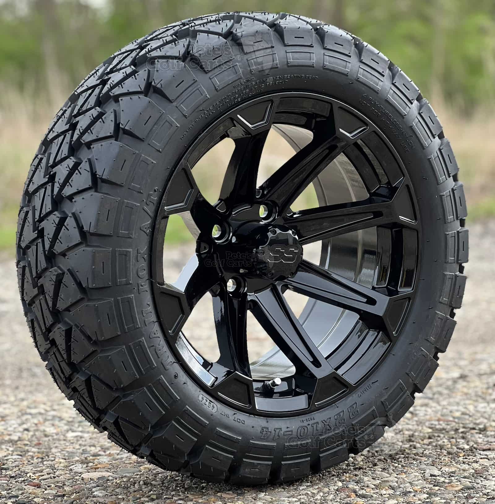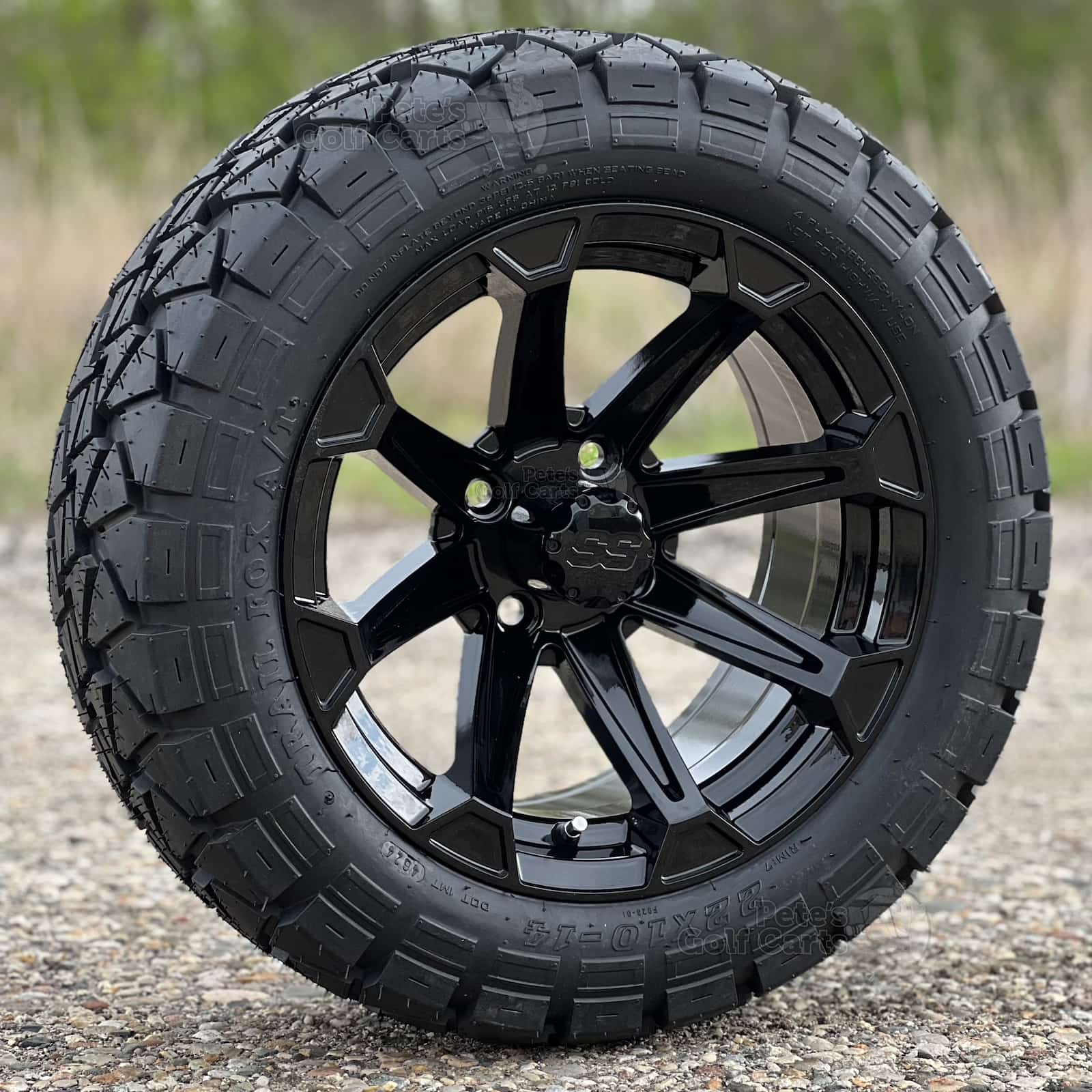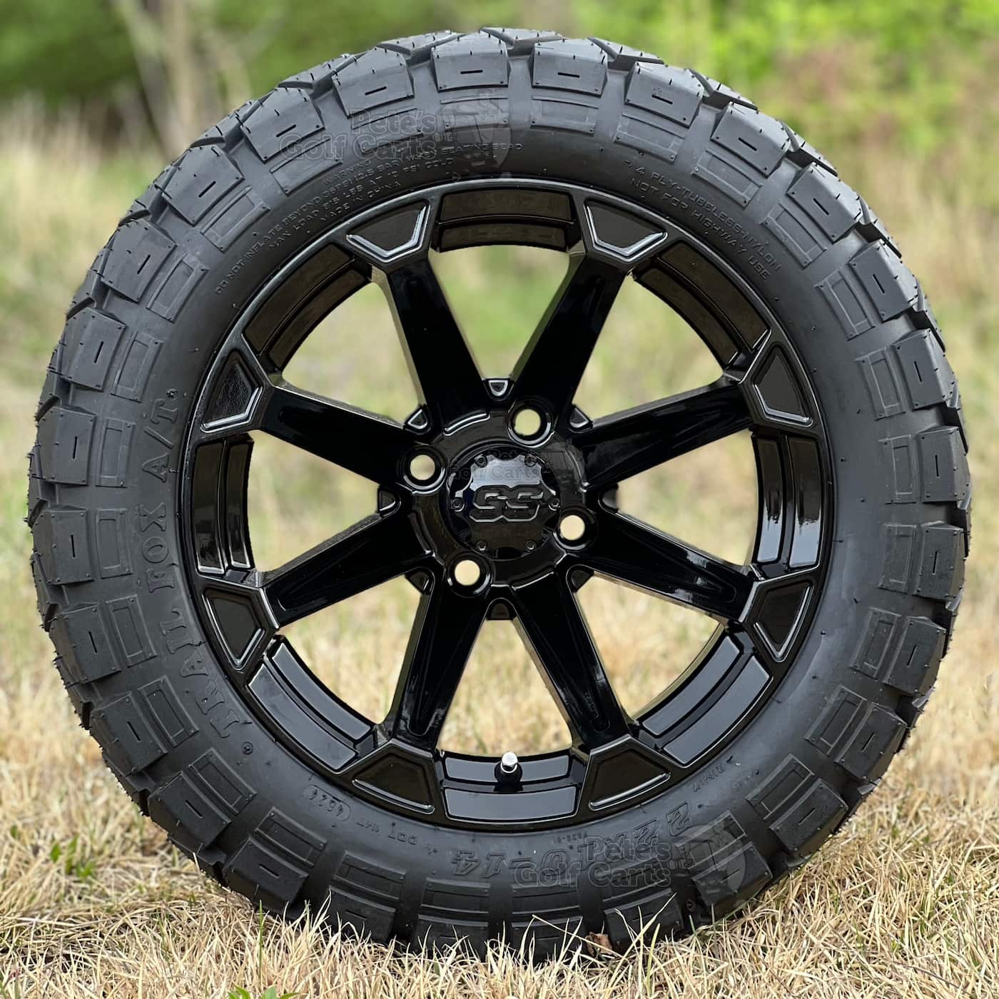 Do you love the old MadJax Timberwolf Tires (Now GTW Timberwolf)? Those Timberwolf tires are a fantastic tire! The Trail Fox the exact same tire tread, same specs, at a fraction of the price. People are catching on and ordering these sweet Trail Fox tires that are DOT approved and great on trails as well as hard surfaces like pavement and paths. We have paired this popular 22×10-14 Tire with the 14″ Viking gloss black golf cart wheel for a killer combo. The gloss black spokes of the Viking wheel shine brilliantly to catch the eyes of onlookers as you roll by. A perfect match for your lifted EZGO, Club Car or Yamaha golf cart!