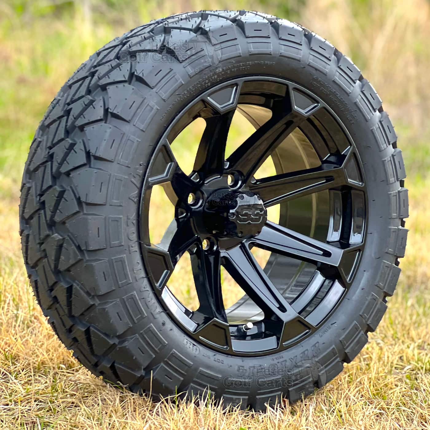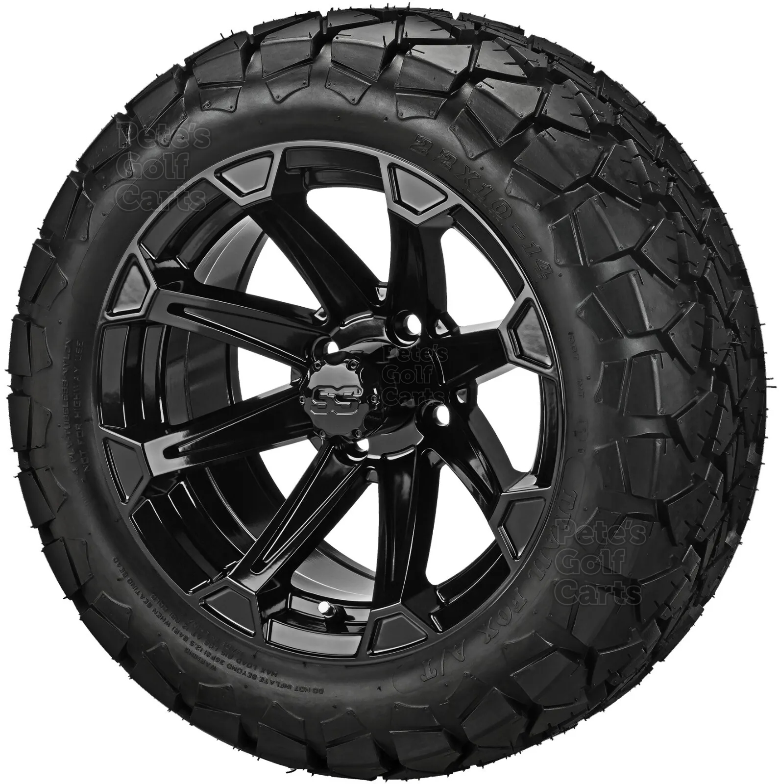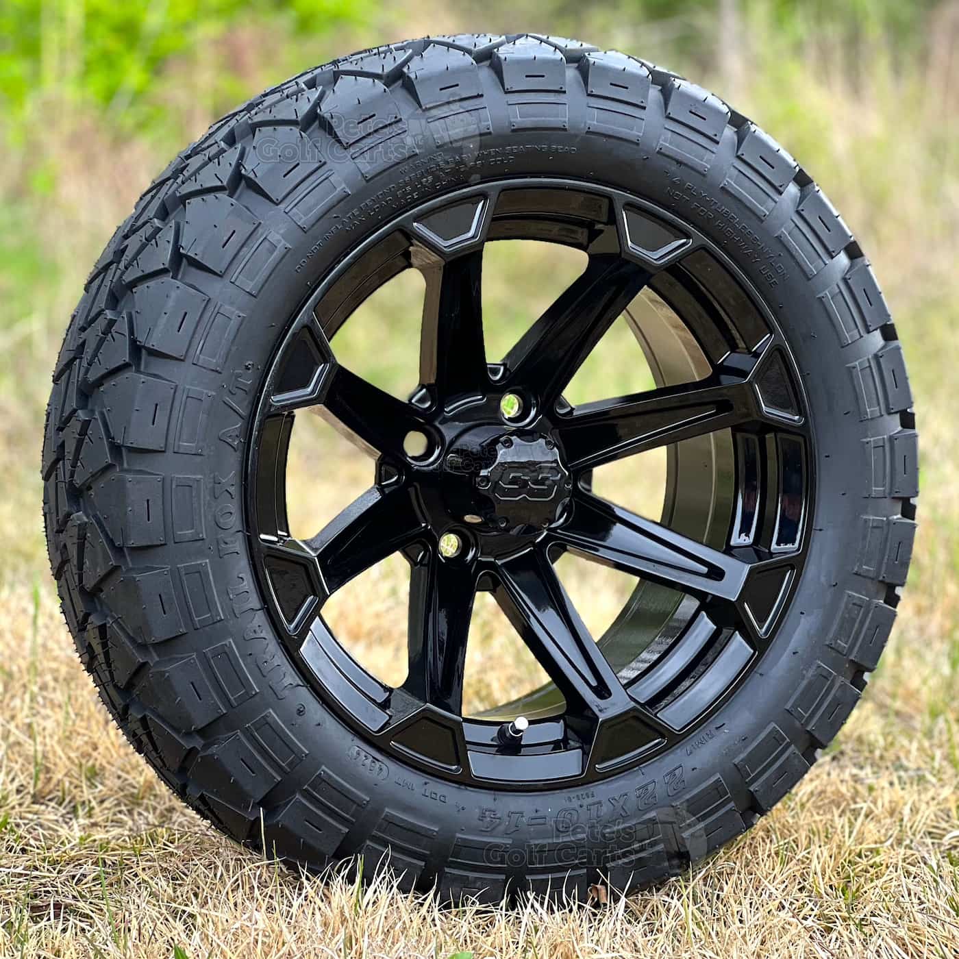 Do you love the old MadJax Timberwolf Tires (Now GTW Timberwolf)? Those Timberwolf tires are a fantastic tire! The Trail Fox the exact same tire tread, same specs, at a fraction of the price. People are catching on and ordering these sweet Trail Fox tires that are DOT approved and great on trails as well as hard surfaces like pavement and paths. We have paired this popular 22×10-14 Tire with the 14″ Viking gloss black golf cart wheel for a killer combo. The gloss black spokes of the Viking wheel shine brilliantly to catch the eyes of onlookers as you roll by. A perfect match for your lifted EZGO, Club Car or Yamaha golf cart!