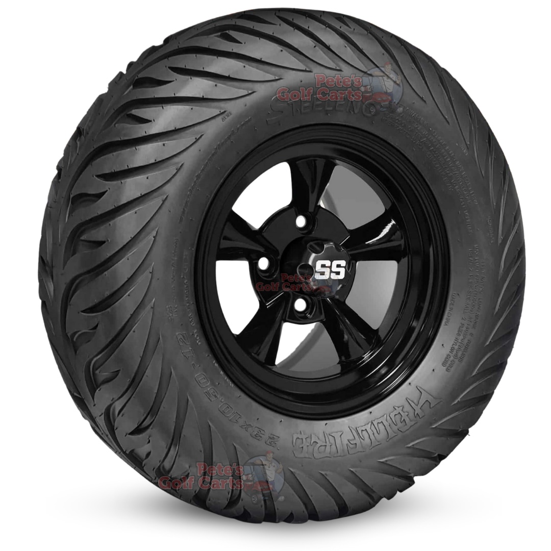 Make your golf cart an offer it canโt refuse with the 12″ Godfather Gloss Black Aluminum Golf Cart Wheels and 23×10.5-12 Hellfire TiresCombo! This Lifted golf cart wheel and tire combo combines commanding style with all-around performance. The deep gloss-black finish delivers a mob-like appearance that gives your cart the edge, turning heads on the course or in the neighborhood. Paired with 23″ Hellfire Street/Turf tires that are DOT-approved and gentle on turf, youโll enjoy reliable traction, versatile handling, and street ready performance.