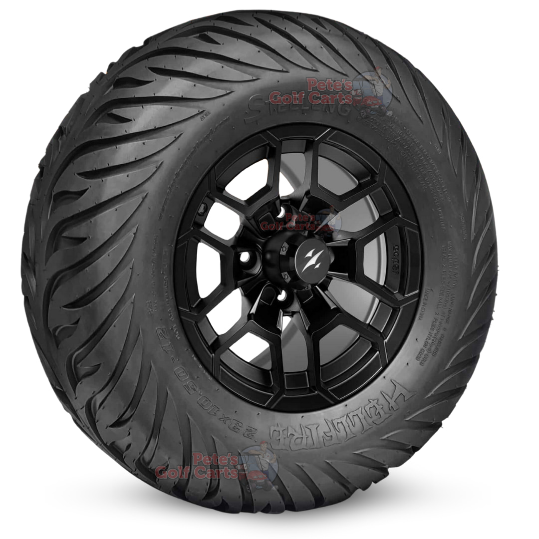 The 12″ Talon Matte Black Golf Cart Wheels have been combined with the 23×10.5-12 Hellfire Golf Cart Tires which are great both on the turf and on the street. The directional tread design of the Hellfire are sporty and engineered for peak performance on hard surfaces while remaining gentle on your lawn or on the fairway. Whether you’re hitting the course with your buddies or cruising the neighborhood streets, these durable street & turf golf cart tires give you the traction you need and the attention you crave. You’ve got to see these wheels and tires in person as pictures do not do them justice!