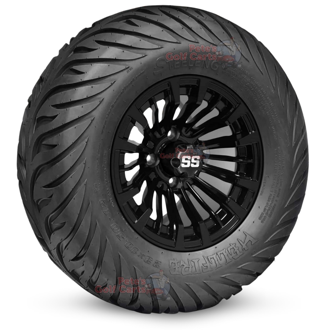 12″ Matador Gloss Black Golf Cart Wheels and 23″ย Street/Turf Golf Cart Tires Combo (23″ tall)
