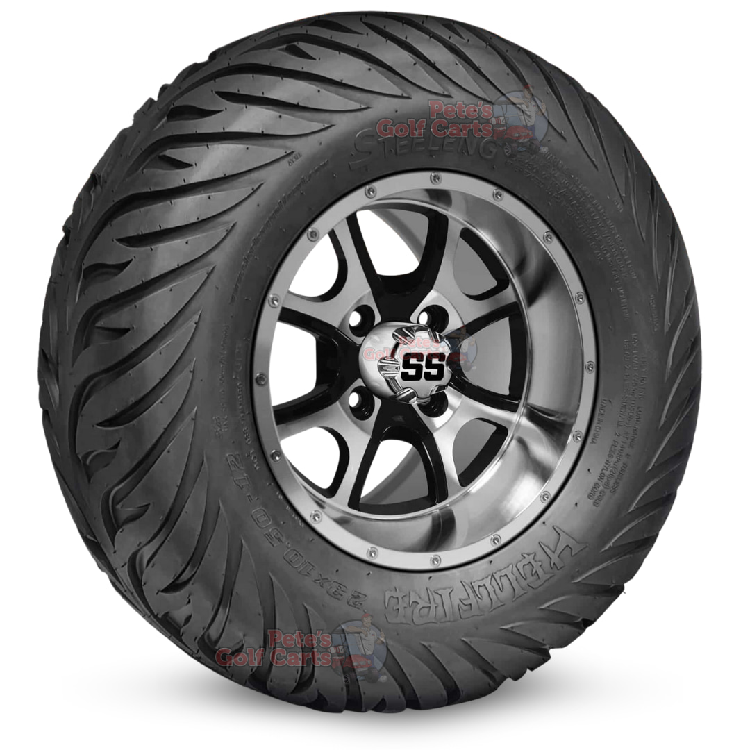 Upgrade your lifted golf cart with these 12โณ Predator Black & Machined Golf Cart Wheels and 23×10.5-12 Hellfire Street/Turf Tires! This sharp machined and black lifted golf cart wheel and tire combo is built for thrill seekers that want a great look on their cart. The lightweight aluminum Predator wheels feature a machined face over a gloss black base that delivers a sweet custom look. We’ve taken these popular alloys and mounted them to our DOT-approved Hellfire Street tires (23โณ tall) that give you excellent grip, street-ready durability, and a commanding stance.