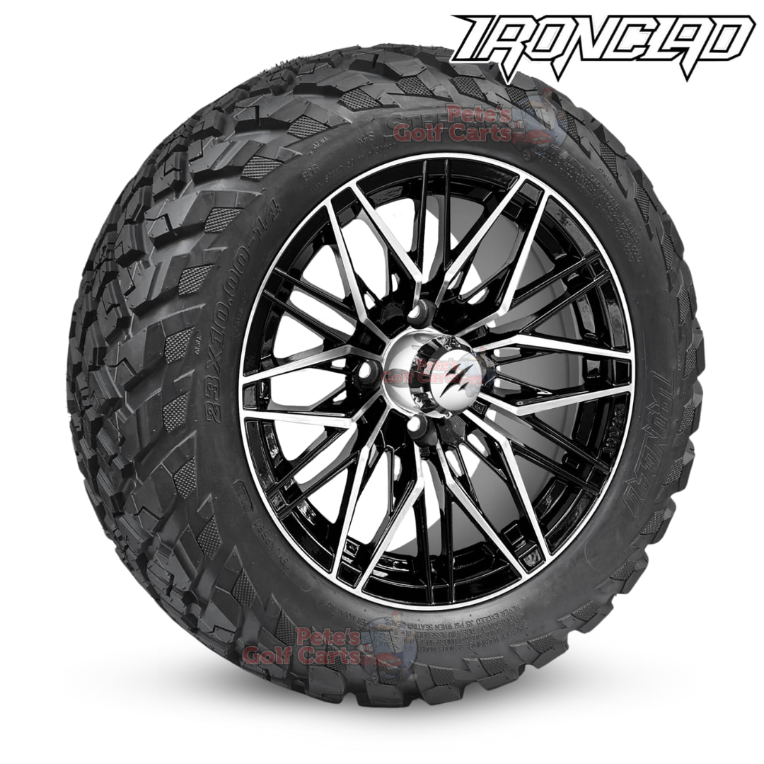 Unleash unmatched style and performance with the 14″ Hornet Black/Machined Golf Cart Wheel & Tire Combo. Paired with rugged Ironclad 23×10-14 All-Terrain Tires (Wanda P3118), this setup delivers great traction on trails, campgrounds, farm land and anywhere in between. These non-directional all terrain golf cart tires are built for durability, grip, and smooth handling across just about any terrain.