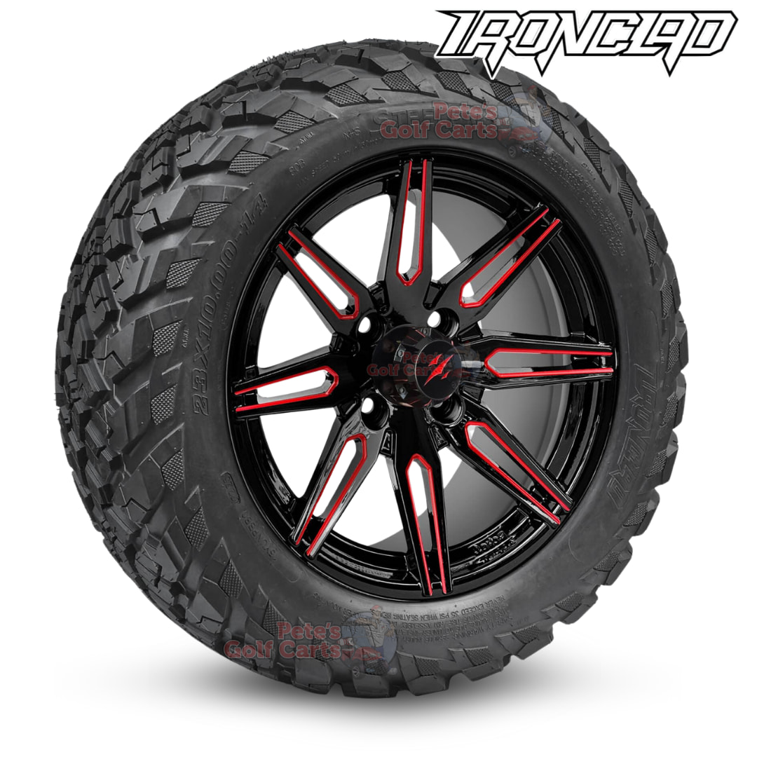 14″ Lynx Red/Black Golf Cart Wheels and 23″ย All Terrain Tires Combo – Set of 4 (23″ tall)