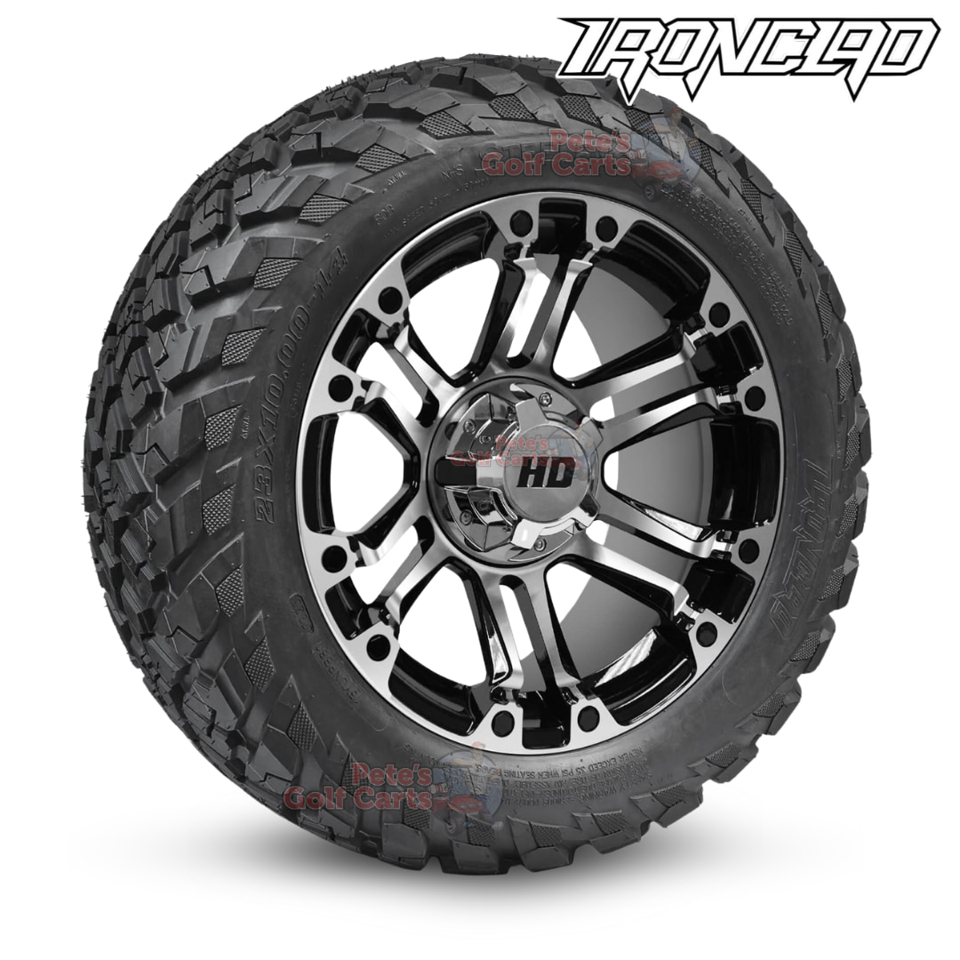 Dominate any trail with our 14″ Rhino Black/Machined Golf Cart Wheel & Tire Combo. Built for lifted carts that demand power and style! The Rhino golf cart wheel blends the iconic HD3 look with Terminator-inspired muscle that ends up delivering a bold 6-spoke design that turns heads instantly. Paired with the rugged Ironclad 23×10-14 All-Terrain Tires, this combo crushes campground paths, farm roads, and everything in between. The Wanda P3118 non-directional tread provides unbeatable traction, smooth handling, and unmatched style.