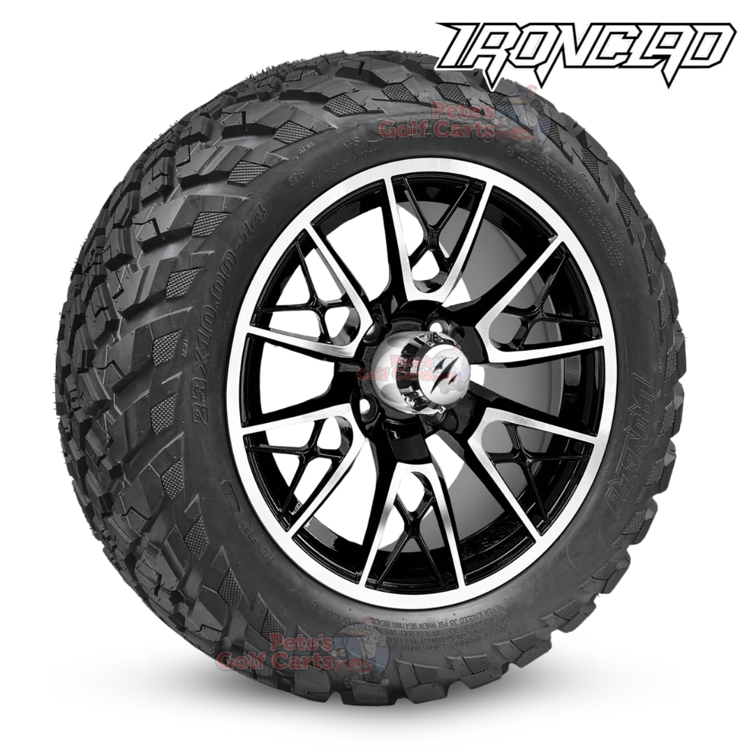 Unlock more style and performance with the 14″ Saber Tooth Black/Machined Golf Cart Wheels and Ironclad 23×10-14 All Terrain Golf Cart Tires Combo. The machined spokes on the 14×7″ Saber Tooth wheels shine brilliantly and grab the attention of onlookers far and wide. Mounted on the rugged Wanda P3118 (Ironclad) golf cart tires, this set delivers killer traction on trails, campgrounds and other off road terrain while remaining relatively quiet on the streets and hard surfaces.
