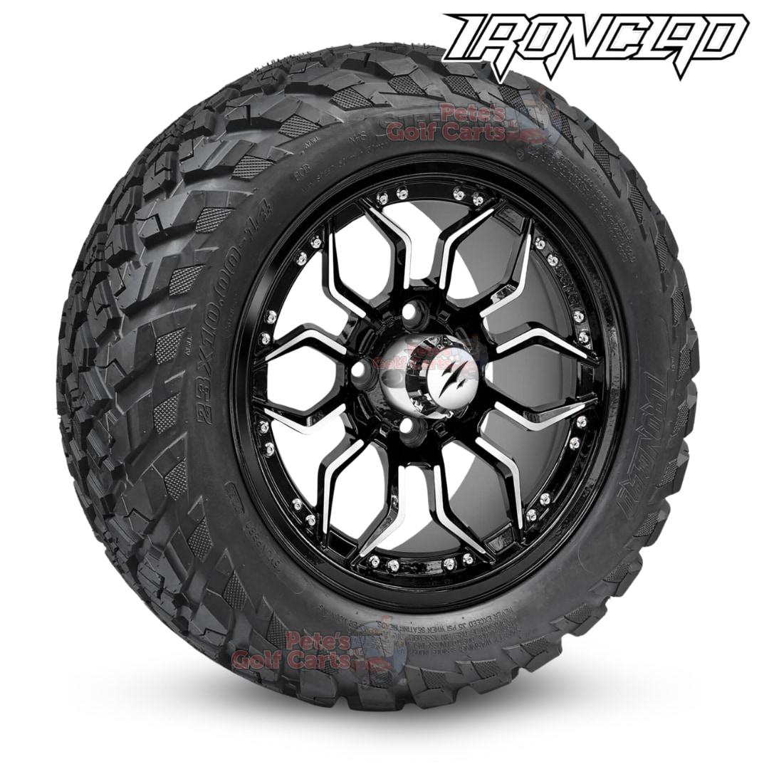 Dominate every golf cart ride with our 14″ Scorpion Black/Machined Golf Cart Wheels paired with Ironclad 23×10-14 All-Terrain Golf Cart Tires. These Wanda P3118 non-directional tires deliver killer traction on campgrounds, farms, trails and really anywhere you roll. Tough, stylish, and built for performance, this lifted golf cart wheel and tire combo instantly upgrades your golf cart’ appearance and capability.