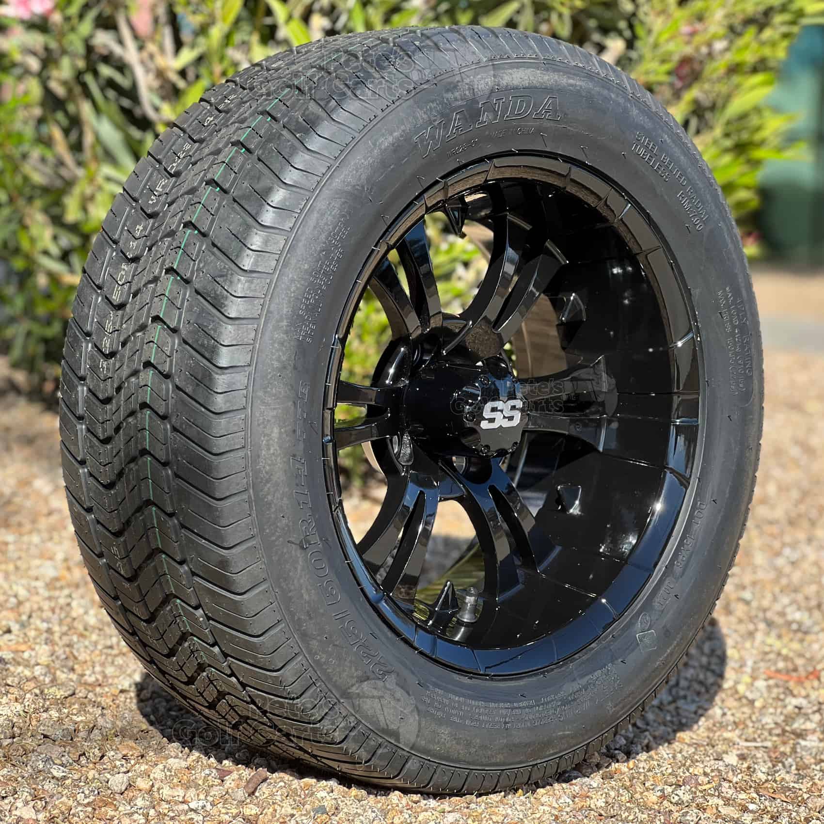 - 4 Brand new 14″ Vampire Gloss Black Golf Cart Wheels mounted on
