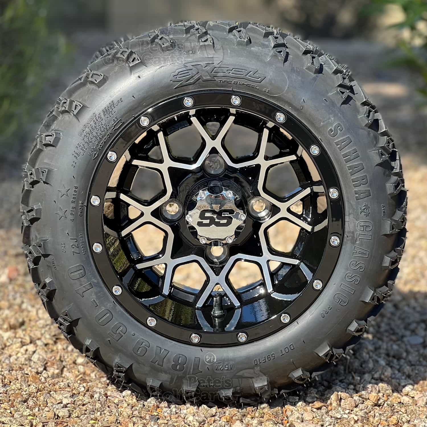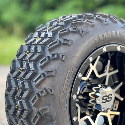 Perfect for your non-lifted golf cart! The beautiful black/machined 10″ Matrix golf cart wheels with our 18″ tallDOT All Terrain Tires! Your cart will draw attention and you’ll feel on top of the world in no time with this simple addition that does not require a lift it! Now offered with your choice of tires, you can confidently choose the best tire for your budget and application!