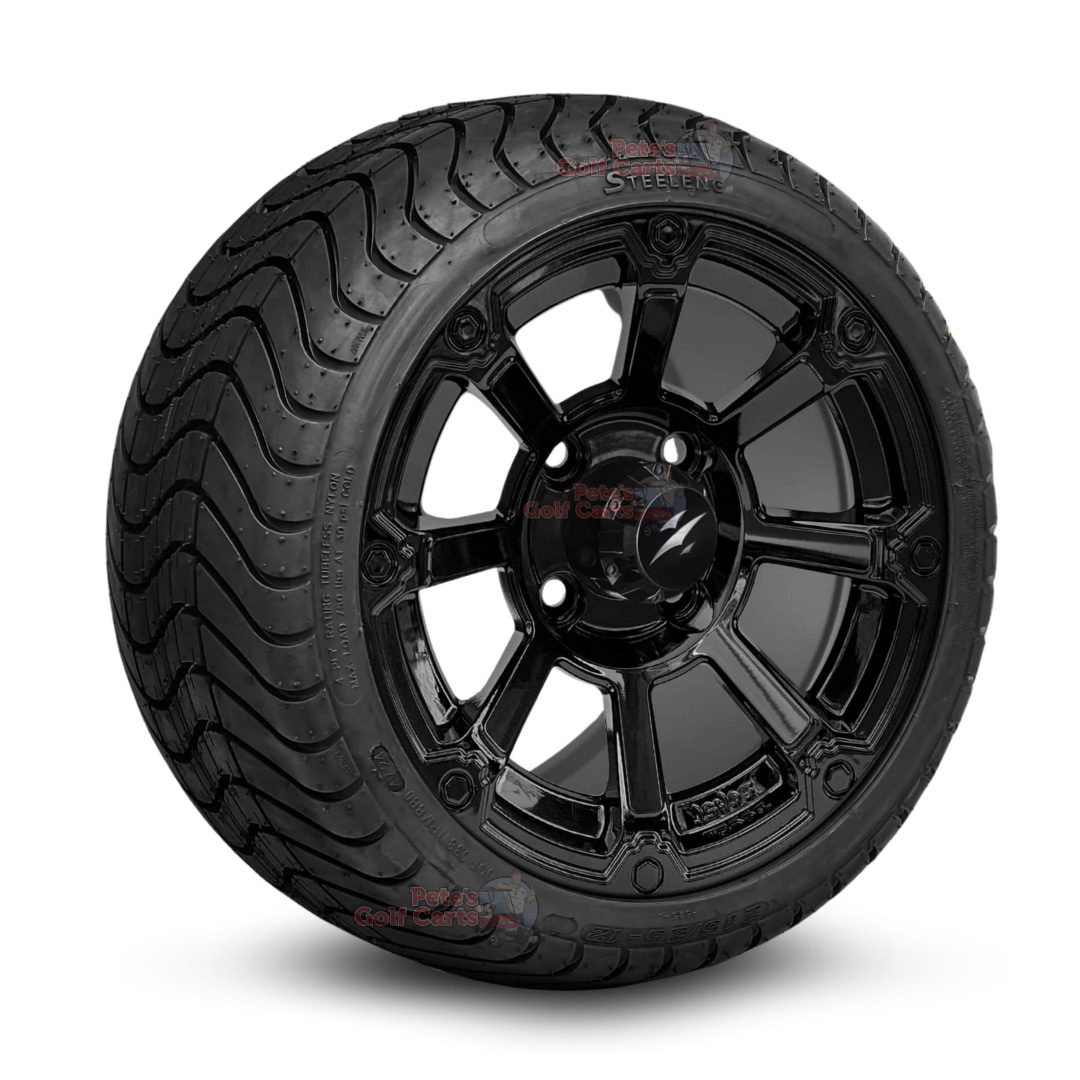 12″ Cyclops Gloss Black Golf Cart Wheels and 18″ Tall Street/Turf Golf Cart Tires Combo – Set of 4