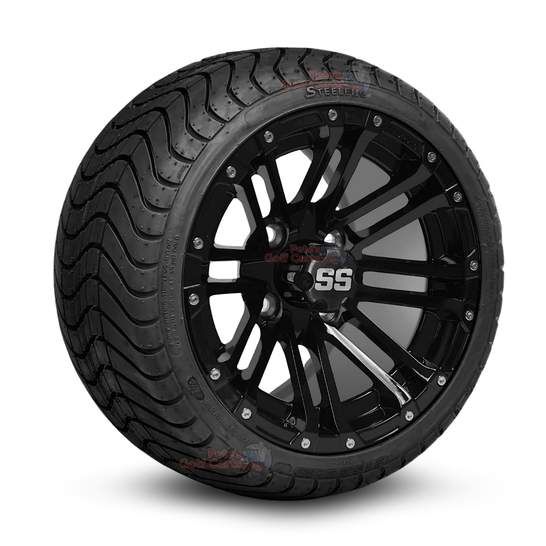 Raise the bar with our 12โณ HD3 Gloss Black Golf Cart Wheels & 215/35-12 DOT Street & Turf Tires combo. This non-lifted golf cart wheel and tire combo is 18โณ tall and is designed for stock (non-lifted) golf carts with zero modifications! You read that correctly – no lift kit, no hassle, no headaches. The sharp HD3 Gloss Black wheels bring heavy-duty style, while the street & turf tires cruise smoothly on pavement and stay gentle on grass and fairways. Sold and arriving on your doorstep as a complete bolt-on set of four, itโs a glow-up your cart will never forget.