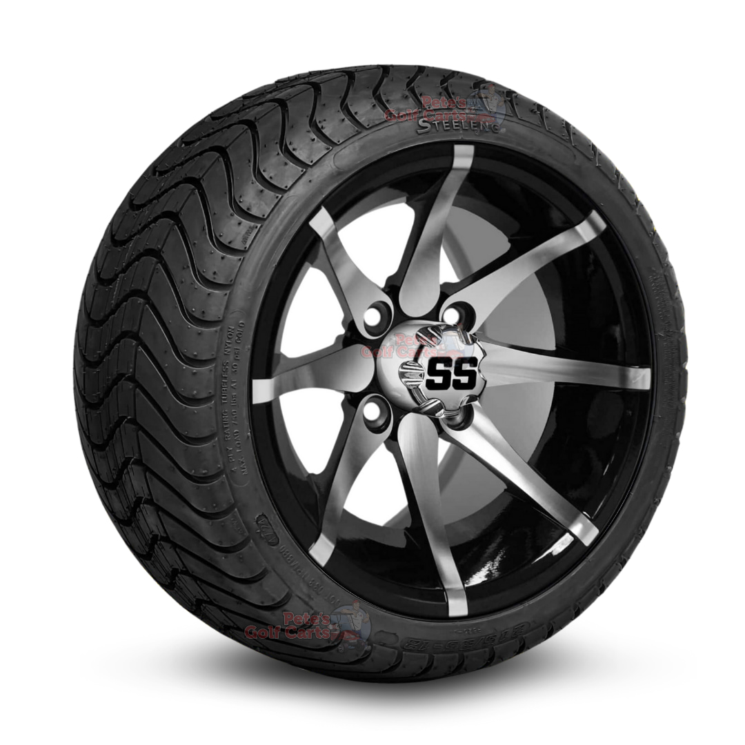 12″ Kraken Black/Machined Golf Cart Wheels and 18″ Tall Street/Turf Golf Cart Tires Combo – Set of 4