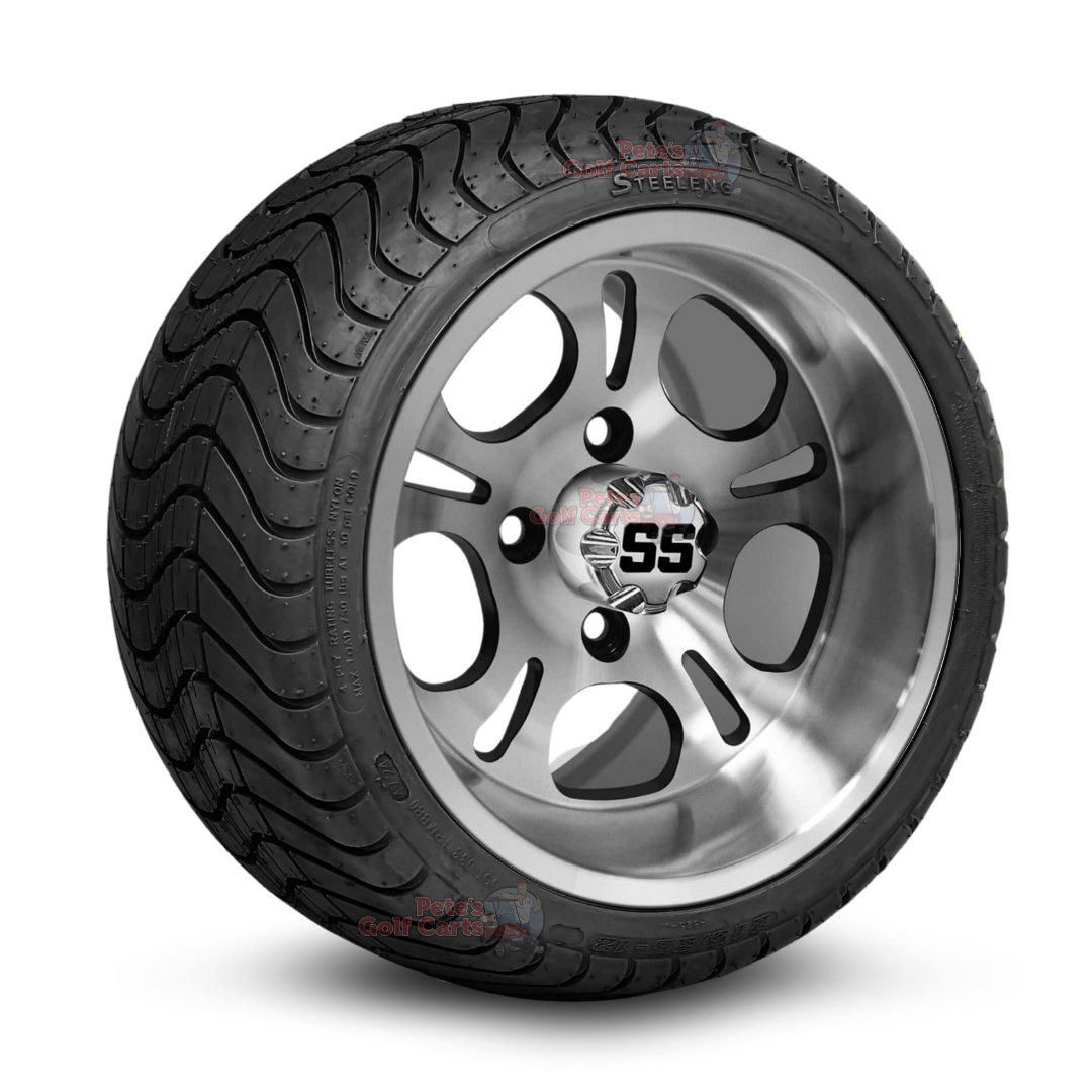 Brighten up your golf cart with our 12″ Lightside Machined Wheels and 215/35-12 DOT Street & Turf Tires combo. This non-lifted wheel and tire package stands 18″ tall and fits all stock (non-lifted) golf carts with zero modifications or lift kit required. This complete and ready-to-bolt-on set of four package transforms your cart the moment it hits the hubs. The 215/35-12 tires deliver smooth, quiet performance on neighborhood streets while staying gentle on grass and golf course fairways.