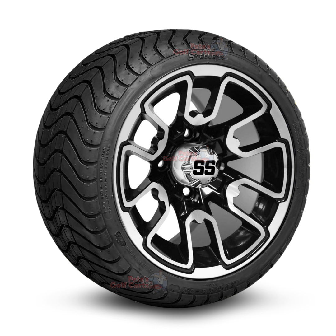 12″ Lizard Black/Machined Golf Cart Wheels and 18″ Tall Street/Turf Golf Cart Tires Combo – Set of 4