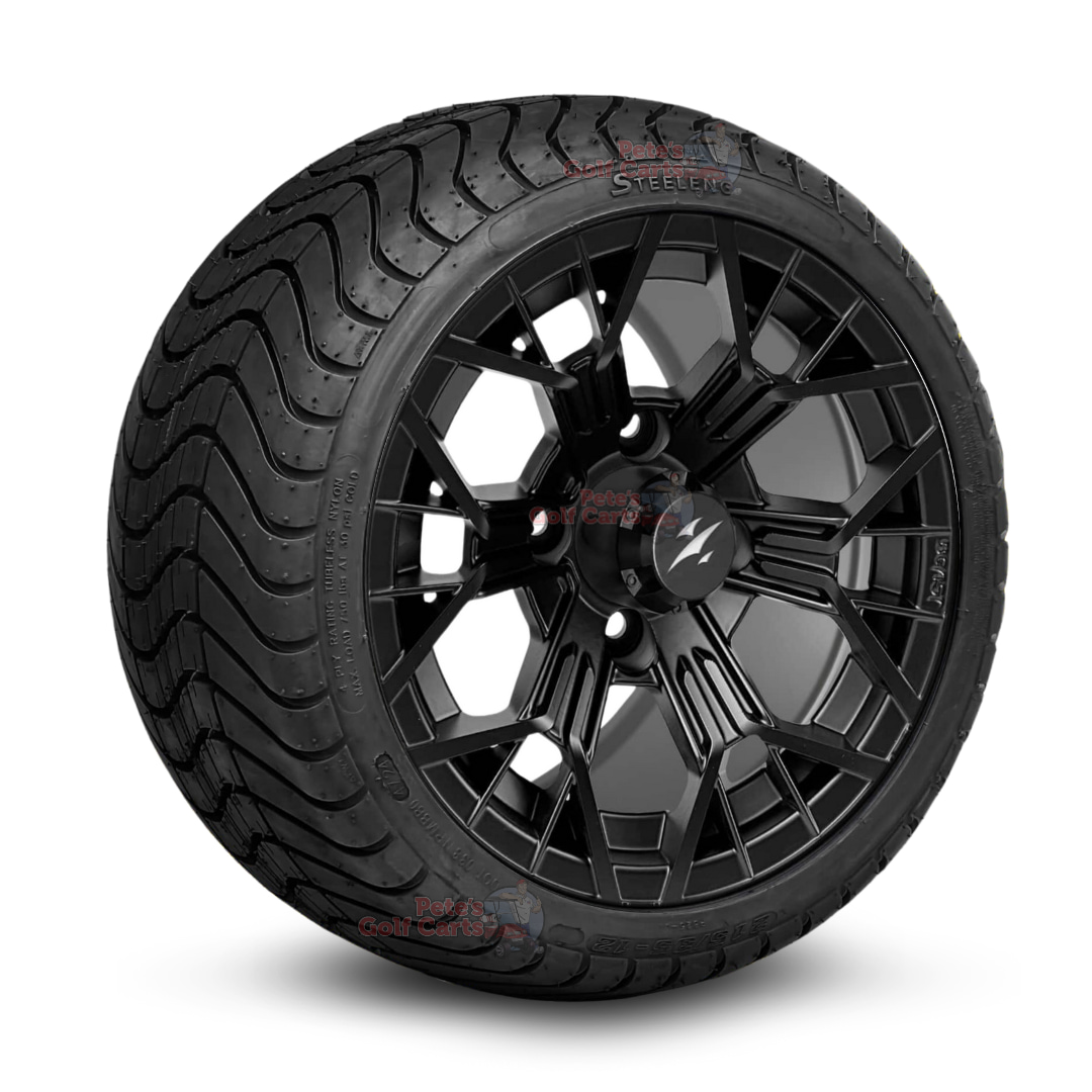 Our 12โณ Mantis Matte Black Golf Cart Wheels & 215/35-12 DOT Street & Turf Tires combo will give your stock golf cart a killer makeover instantly! Designed to fit seamlessly on non-lifted (stock) golf carts, this 18โณ tall setup installs quickly with zero modifications needed. No lift kit and no headaches! These stealthy 12″ matte black Mantis wheels bring aggressive style, while the 18″ tall street & turf tires (3″ of sidewall around that 12″ wheel) glide smoothly on pavement and stay gentle on grass. Sold as a complete set of four, itโs an instant bolt-on upgrade.
