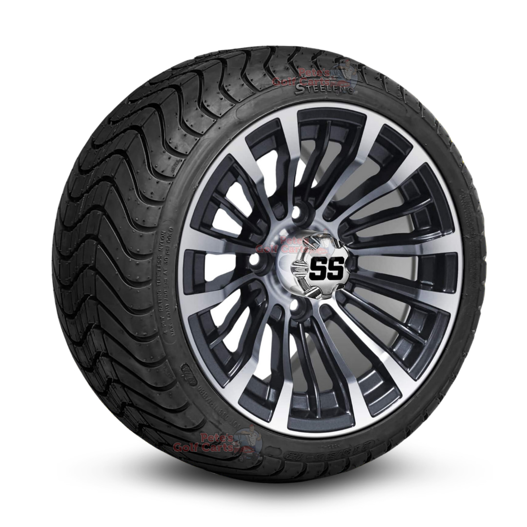 12″ Matador Gunmetal Golf Cart Wheels and 18″ Tall Street/Turf Golf Cart Tires Combo – Set of 4