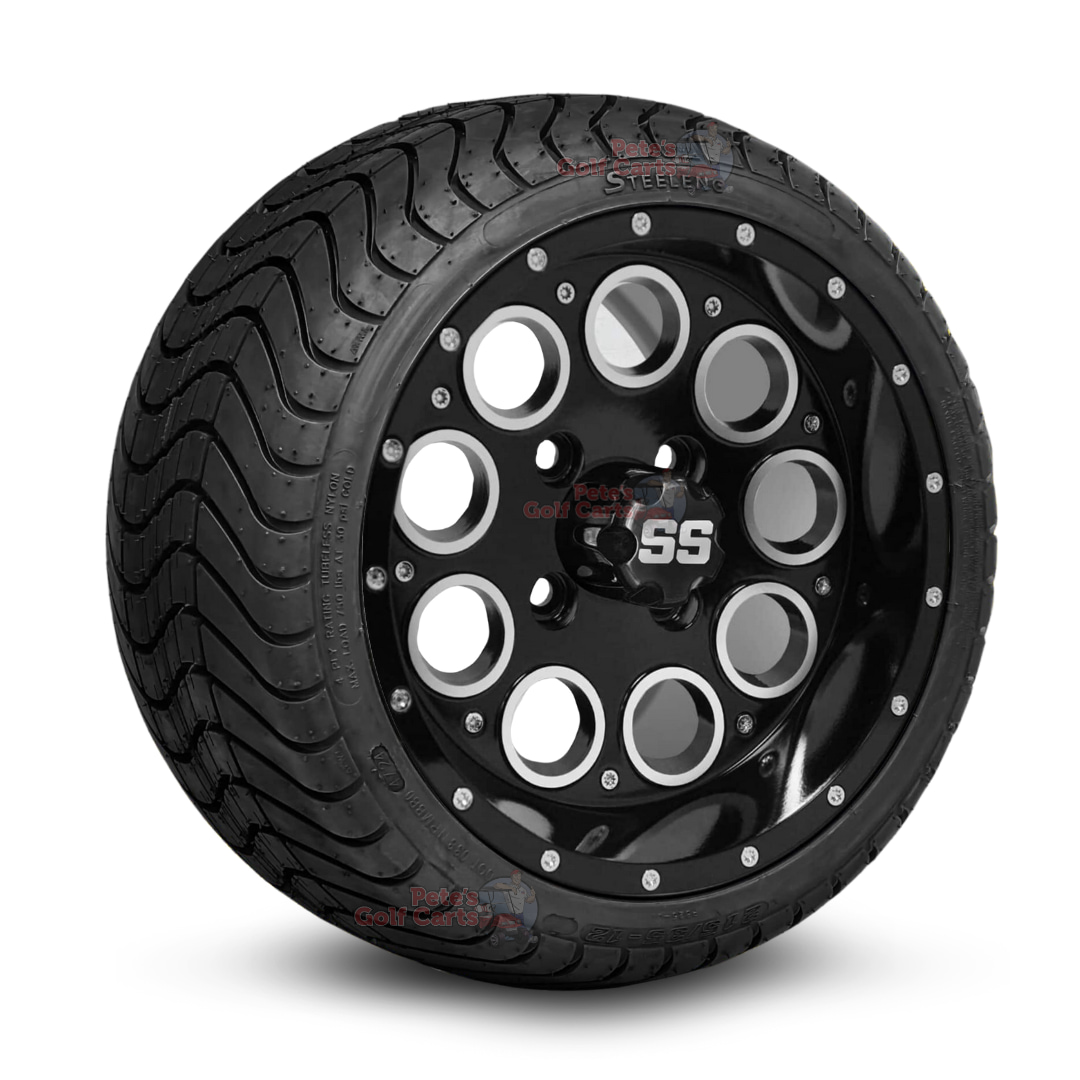 12″ Pioneer Gloss Black Golf Cart Wheels and 18″ Tall Street/Turf Golf Cart Tires Combo – Set of 4