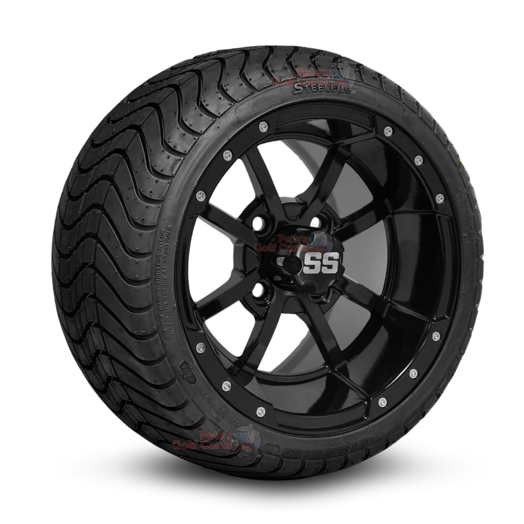 Command attention with the 12โณ Storm Trooper Gloss Black Golf Cart Wheels & 215/35-12 DOT Street & Turf Tires combo. Coming in at 18โณ tall, this non-lift golf cart wheel and tire package bolts onto any non-lifted golf carts with zero modifications needed. Mission accomplished! The gloss black Storm Trooper wheels bring bold, battle-ready style, while the street & turf tires cruise smoothly on pavement and stay friendly to grass. Sold as a complete set of four for fast installation and instant transformation.