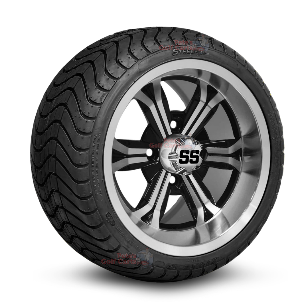Power up your golf cart with our 12″ Transformer Machined Black Wheels and 215/35-12 DOT Street & Turf Tires combo! Thisย dynamic non-lifted wheel and tire combo will have your cart unlocking whole new mode! Standing at a height of 18″, this setup fits all non-lifted golf carts with zero modifications required. Simply unbox and bolt on to your existing hubs and you will experience instant style, smoother performance, and rock-solid compatibility! The 215/35-12 Street tires (Wanda P825) deliver a comfortable ride on neighborhood streets and stay gentle on grass and golf course fairways.