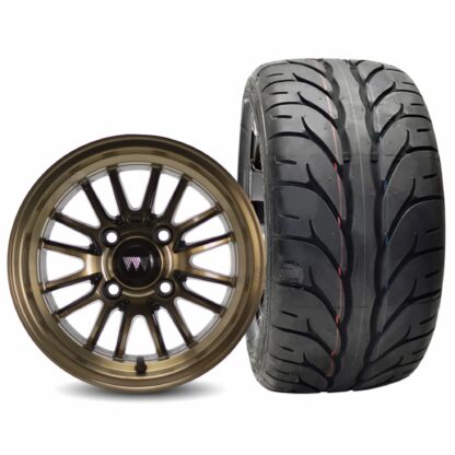 Experience the difference that a quality radial street tire will bring to your golf cart. Designed for applications like streets, pathways, golf courses, and lawns – these tires feature a directional and quiet tread pattern that, paired with these beautiful 12″ TYPE V Bronze golf cart wheels, will make your cart the talk of the neighborhood in no time!