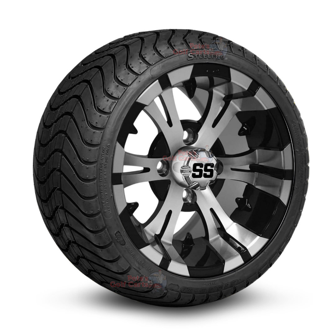 Perfect for your non-lifted golf cart! Purchase these beautiful black/machined 12″ Vampire Golf Cart wheels with our 215/35-12 DOT low profile tires and experience the difference instantly! Your cart will draw attention and you’ll feel on top of the world in no time!