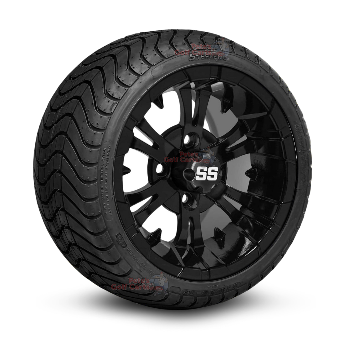 This beautiful 12″ Vampire Gloss Black Golf Cart wheel set comes mounted on our 215/35-12 DOT low profile tires that are turf safe and great on the streets. Your cart will draw attention and you’ll feel on top of the world in no time! Perfect for your non-lifted golf cart!