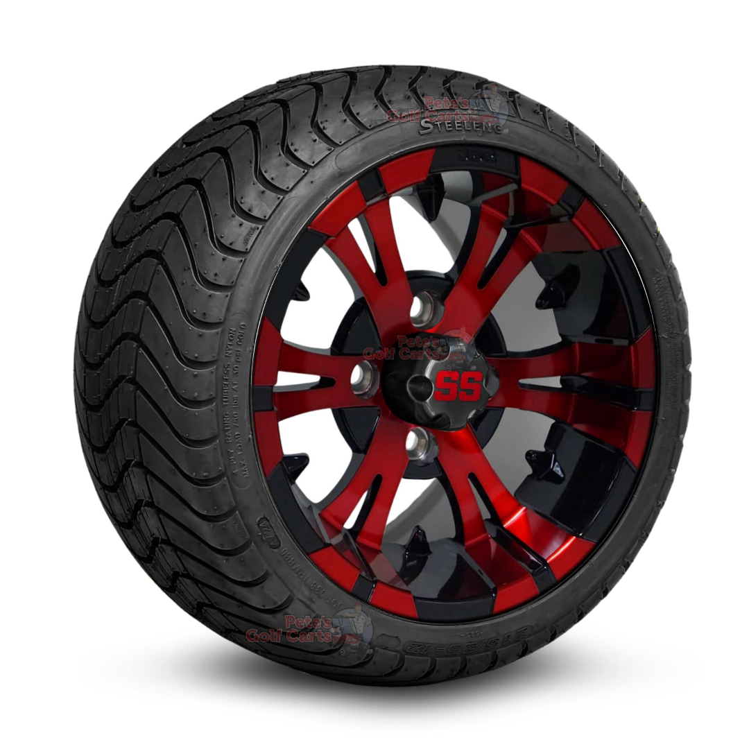 12″ Vampire Red/Black Black Golf Cart Wheels and 18″ Tall Street/Turf Golf Cart Tires Combo – Set of 4