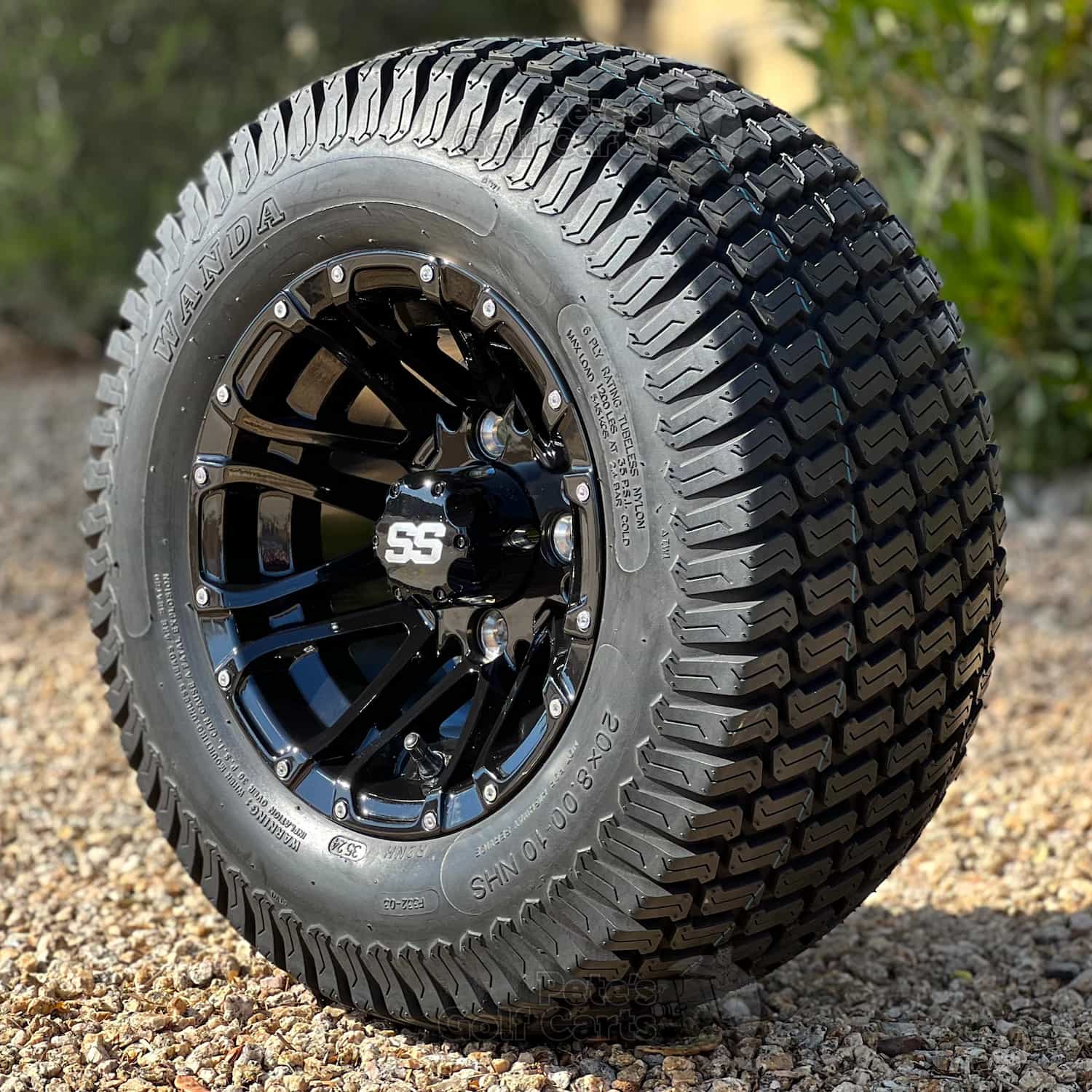 The Gloss Black 10″ HD3 golf cart wheels are a show stopper and a true classic. This 10″ black wheel is now available with the 20×8-10 turf golf cart tires and create a combo that is perfect for many non-lifted golf carts! This P332 tread is approved for the golf course and great on the hard surfaces as well. This gentle turf tire by Wanda provides a turf safe, non-aggressive tread design that still gives your traction when needed while remaining gentle on those golf course fairways. Order your brand new 10″ HD3 gloss black wheels and 20″ turf tire combo and change the looks of your cart!
