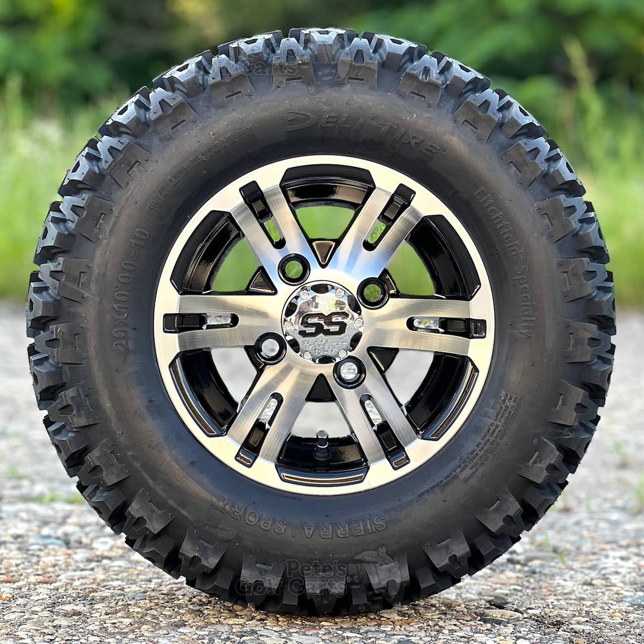 The popular 10″ Bulldog black/machined wheels now come with our 20×10-10 DOT all terrain golf cart tires which are 20″ tall and will fit under EZGO and Yamaha G29, Drive, Drive2 golf carts without a lift kit! Experience the difference that a new set of 10″ Aluminum golf cart wheels will bring to your EZGO, Club Car, or Yamaha cart! Your cart will be turning heads in no time as you roll around town!
