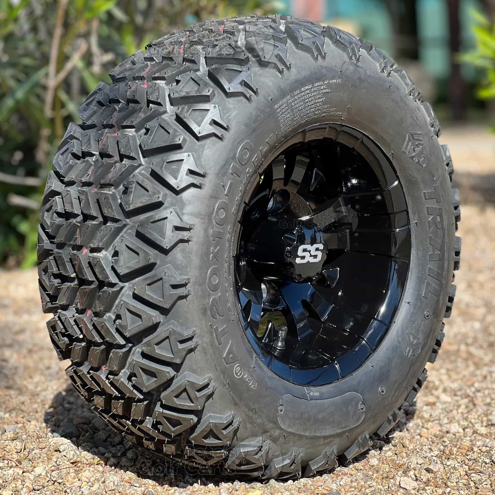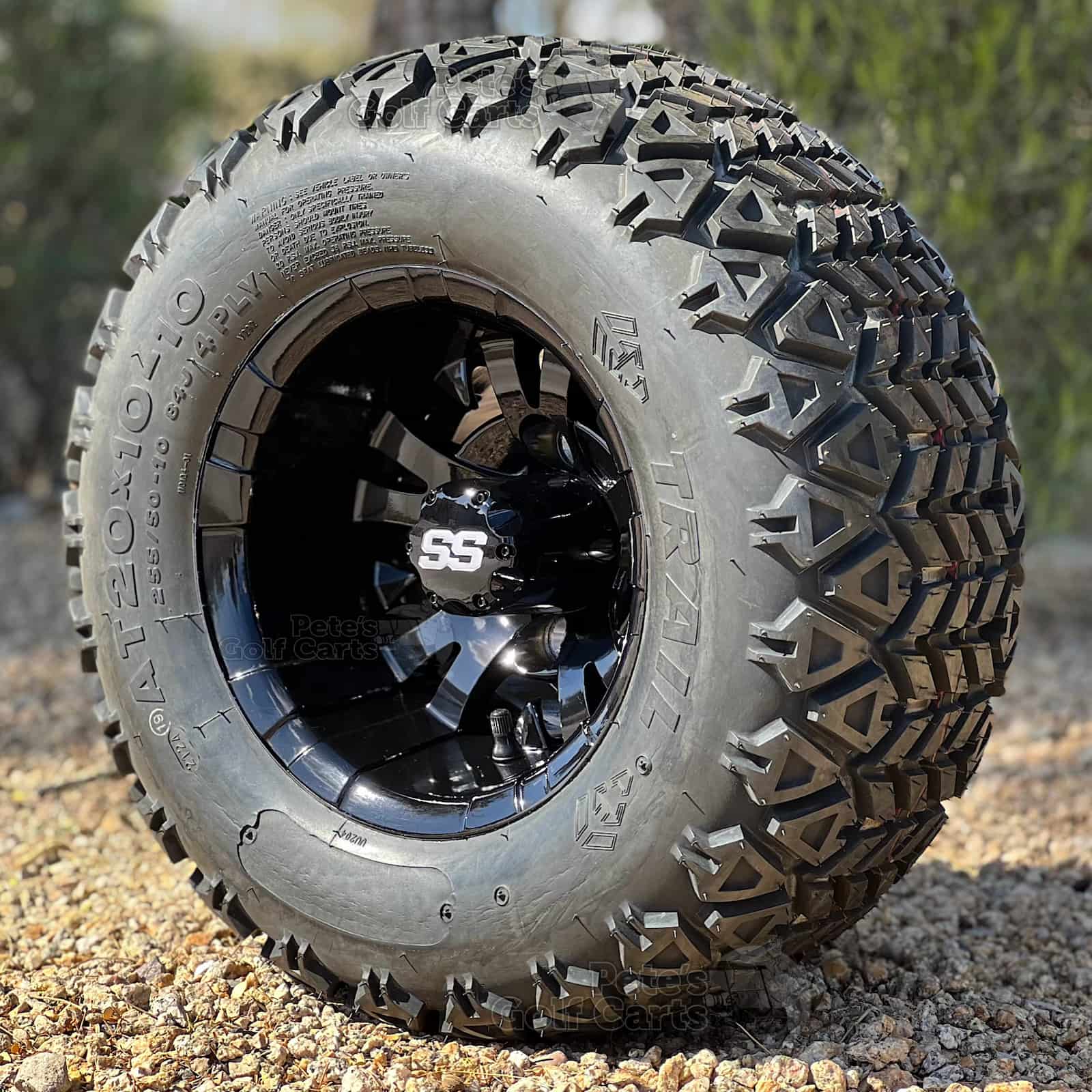 10″ Vampire Gloss Black Aluminum Golf Cart Wheels and 20×10-10 DOT All Terrain Tires Combo – Set of 4 (20″ tall)