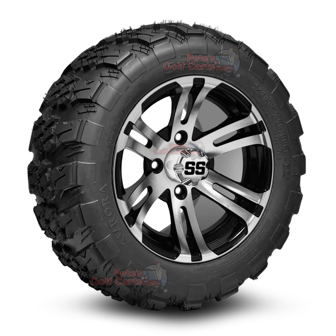 12″ Bulldog Black/Machined Golf Cart Wheels and 20″ย All Terrain Tires Combo – Set of 4 (20″ tall)