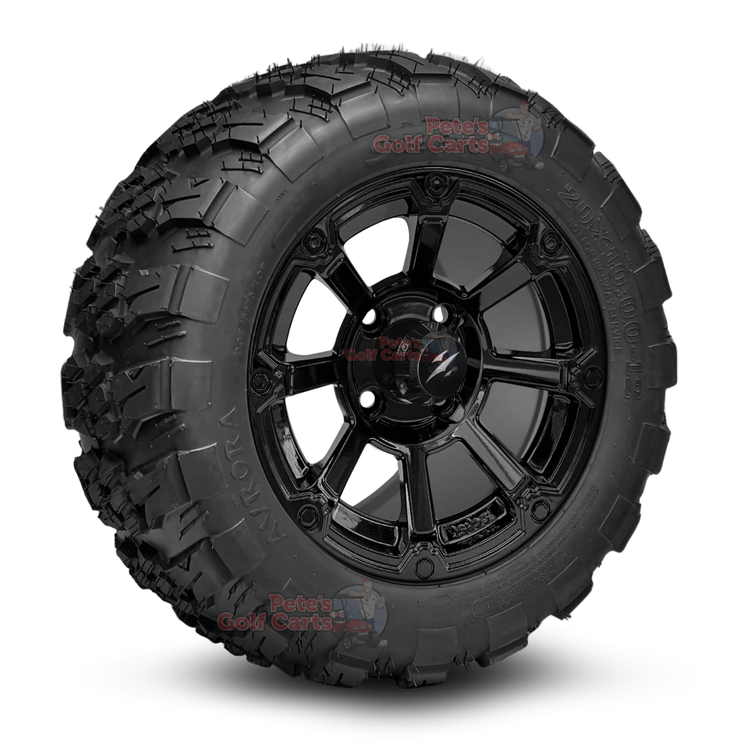 12″ Cyclops Gloss Black Golf Cart Wheels and 20×10-12 Aurora All Terrain Golf Cart Tires Combo – Set of 4 (20″ tall)