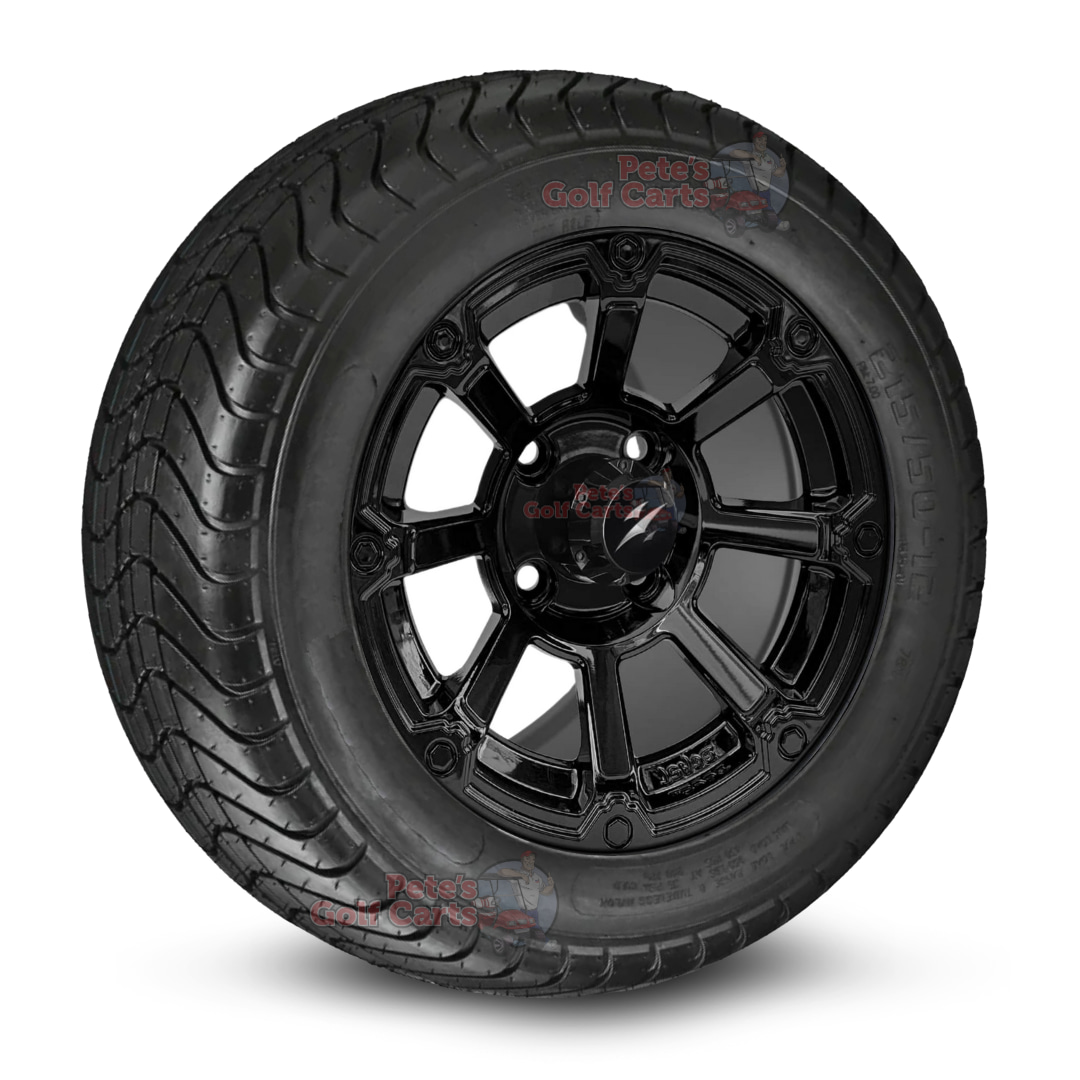 Grab this 12″ gloss black Cyclops wheels and 215/50-12 golf cart tires combo today and get ready to feel the difference!