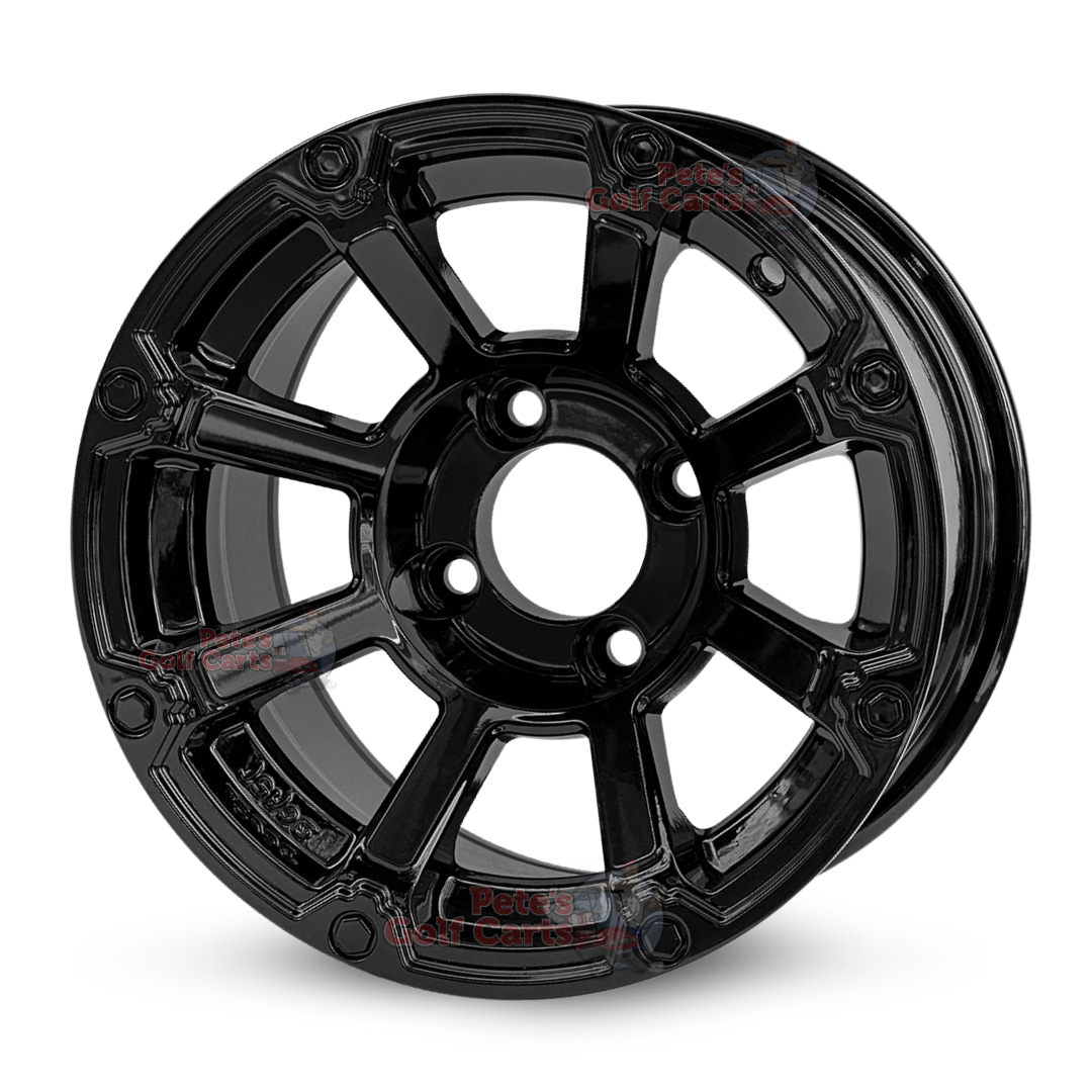 - 4ย x 12″ Cyclops gloss black aluminum golf cart wheels mounted on