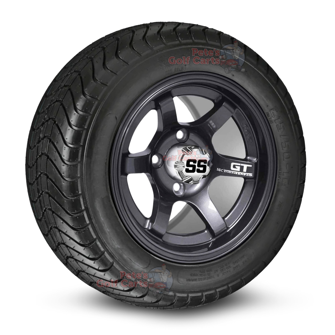 Grab this 12″ gunmetal GT wheels and 215/50-12 golf cart tires combo today and get ready to feel the difference!