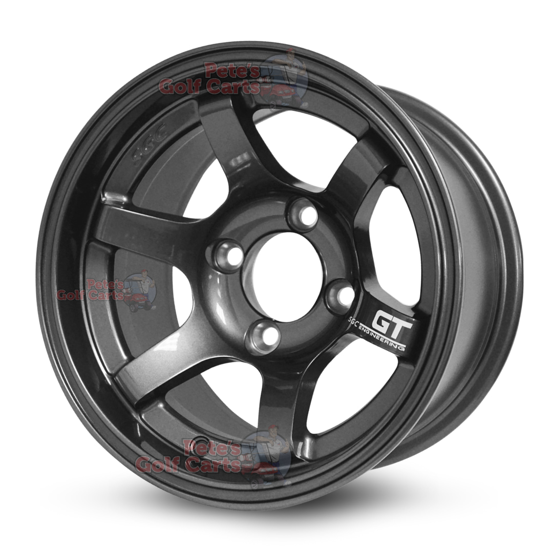 • 4  x 12″ GT gunmetal aluminum golf cart wheels mounted on